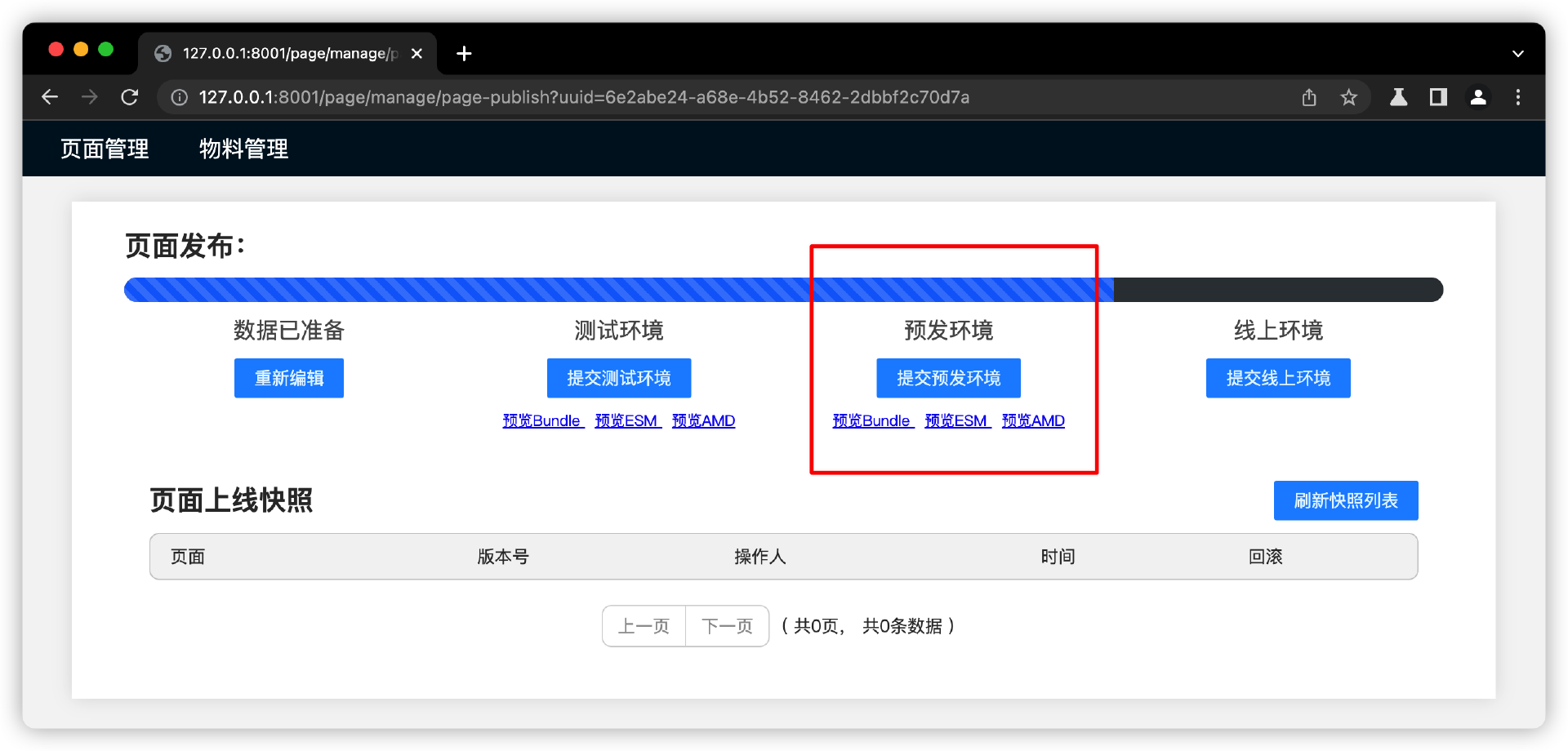 第三阶段,预发阶段。这个阶段,用户可以操作“发布内容”,从测试环境流转到预发环境。这个操作过程可以是纯数据和资源的复制,复制到预发环境中。