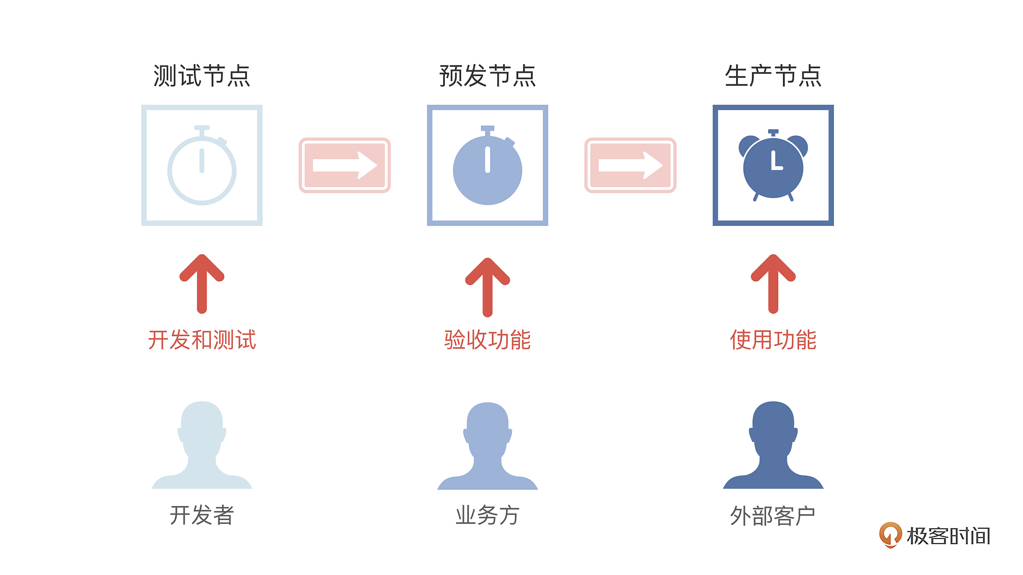 预发布节点,面向的角色是项目经理、产品经理等非开发人员,主要是作为功能验收使用。因为是预备发布上产线的节点,一般称为“预发布节点”,或者简称“预发节点”(在课里我们就统称“预发节点”)。到了这个节点,就不能频繁修改代码或者调整功能了,属于临近发布到产线前的最后一步。