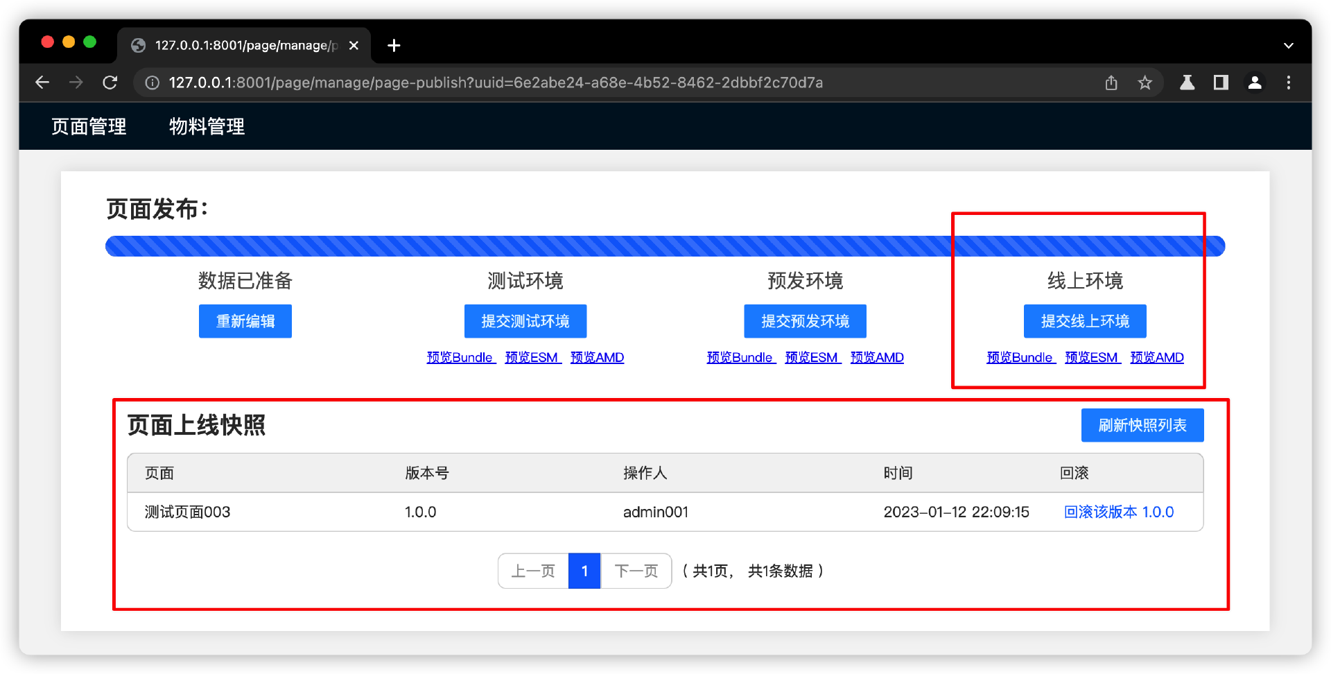 在这个阶段中,用户可以操作触发“待发布的内容”流转到测试环境,把准备阶段的数据转到“测试环境”,同时根据测试环境的页面布局数据,编译测试环境的页面Bundle文件。看课程代码案例截图。