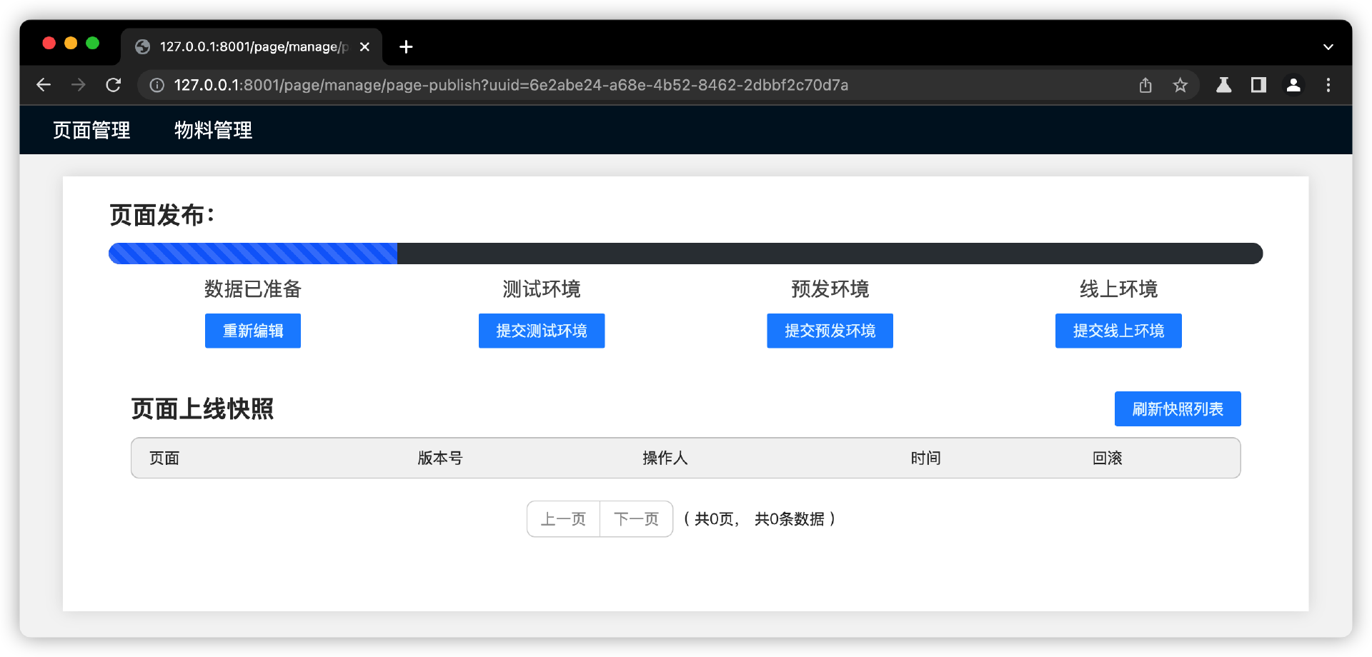 以我们课程的代码案例截图为例。第一张截图是“页面搭建”后,点击“提交页面”,准备进入发布流程。