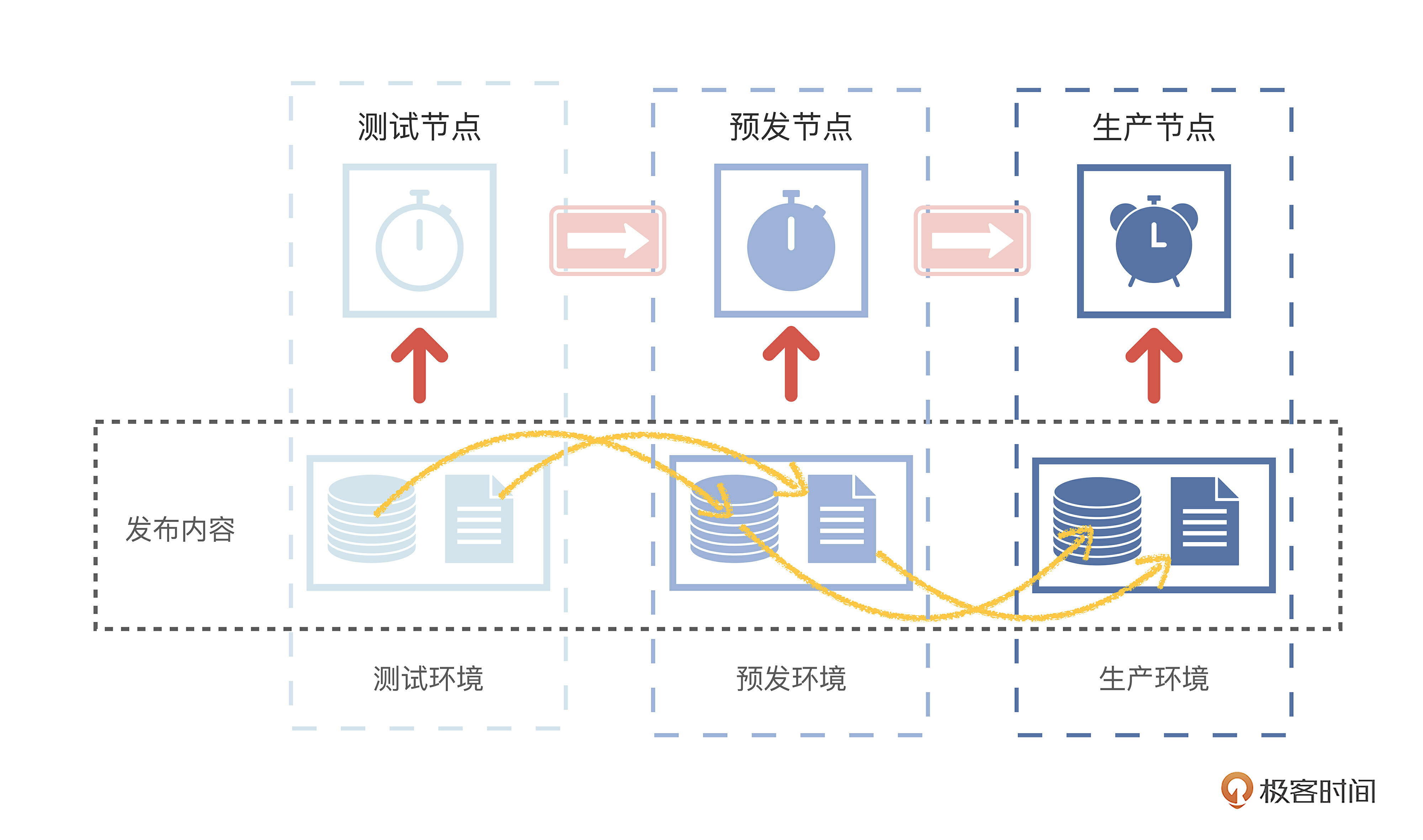 第一点,有流程节点,是指发布流程要有明确的流程节点,而且是面向不同角色的流程节点。一般大厂里,不论是任何技术代码的发布,还是搭建页面的发布,流程基本至少有三个节点,分别是开发测试节点、预发布节点和生产节点。