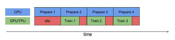 如果不引入流水线模型的话,当 CPU 正在预处理数据时,加速器处于空闲状态。同样,当GPU/TPU正在训练模型时,CPU 处于空闲状态。因此,训练的用时是 CPU 预处理时间和加速器训练时间的总和。
