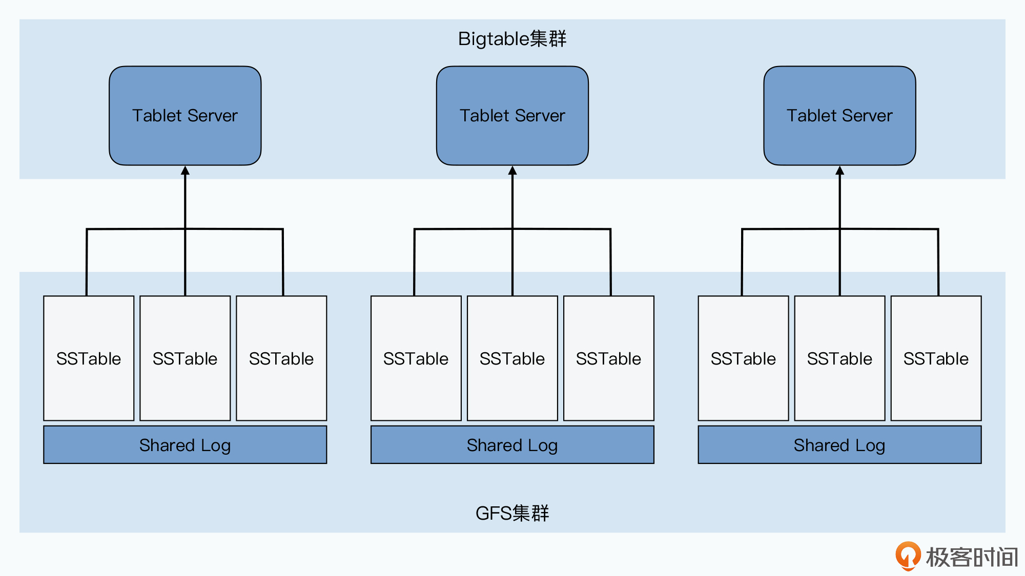 这是因为,Bigtable的Tablet Server只负责在线服务,不负责数据存储。实际的存储,是通过一种叫做SSTable的数据格式写入到GFS上的。也就是Bigtable里,数据存储和在线服务的职责是完全分离的。我们调度Tablet的时候,只是调度在线服务的负载,并不需要把数据也一并搬运走。