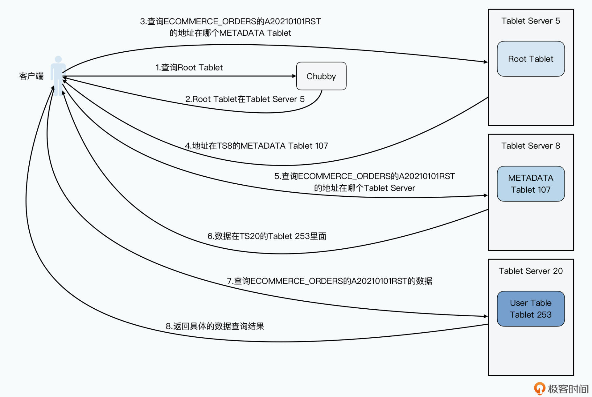 - 然后,客户端再发起请求到TS8,说我要在tablet 107里面,找ECOMMERCE_ORDERS表,行键为A20210101RST具体在哪里。