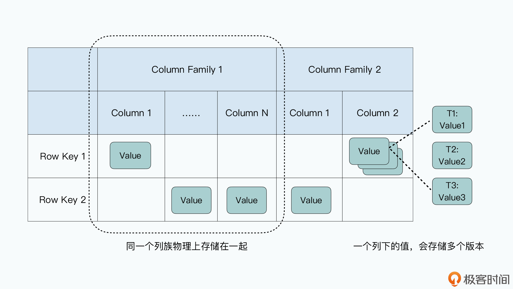 - 每一行里的数据呢,你需要指定一些列族(Column Family),每个列族下,你不需要指定列(Column)。每一条数据都可以有属于自己的列,每一行数据的列也可以完全不一样,因为列不是固定的。这个所谓不是固定的,其实就是列下面没有值。因为Bigtable在底层存储数据的时候,每一条记录都要把列和值存下来,没有值,意味着对应的这一行就没有这个列。这也是为什么说Bigtable是一个“稀疏”的表。