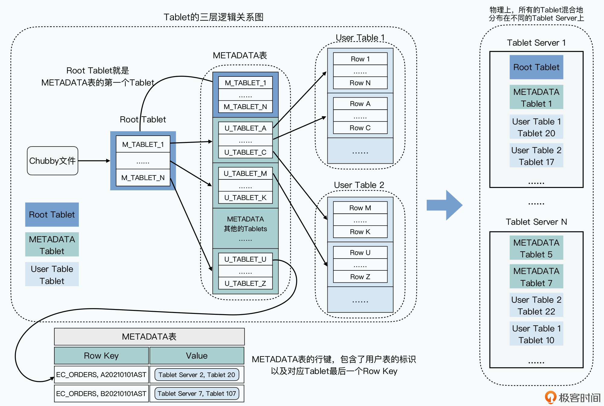- 而METADATA剩下的这些Tablets,每一个Tablet中,都存放了用户创建的那些数据表,所包含的Tablets所在的位置,也就是所谓的User Tablets的位置。