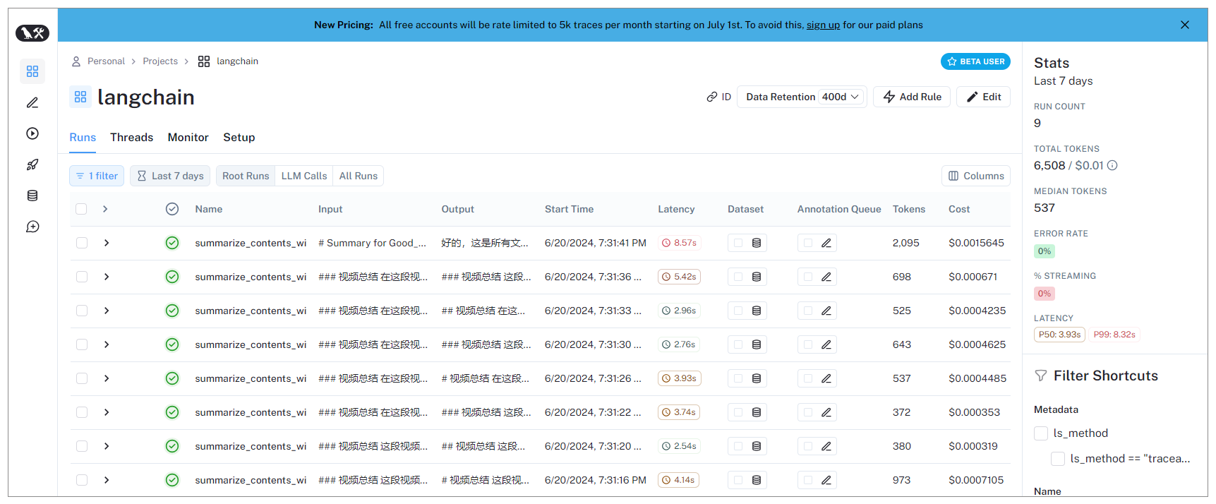 程序运行之后,再度登录LangSmith,将看到程序与大模型的交互细节都被记录。