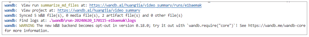 在代码中初始化wandb会话,通过 wandb.init(project="video_summary", name="summarize_md_files")。 在main函数中,逐个处理Markdown文件,调用summarize_contents_with_gpt4o进行总结。 记录每个文件的总结状态和长度,通过wandb.log将总结的文本长度这个信息发送到wandb服务器。同时,在总结过程中捕获异常,并将错误信息记录到wandb。 将所有文件的总结合并成一个文件,并写入指定的输出文件。 通过上述步骤,你可以实现对每个Markdown文件的逐个总结,并使用wandb监控和记录每个总结过程的状态和结果。这不仅有助于跟踪处理进度,还能在出现问题时快速定位并解决。