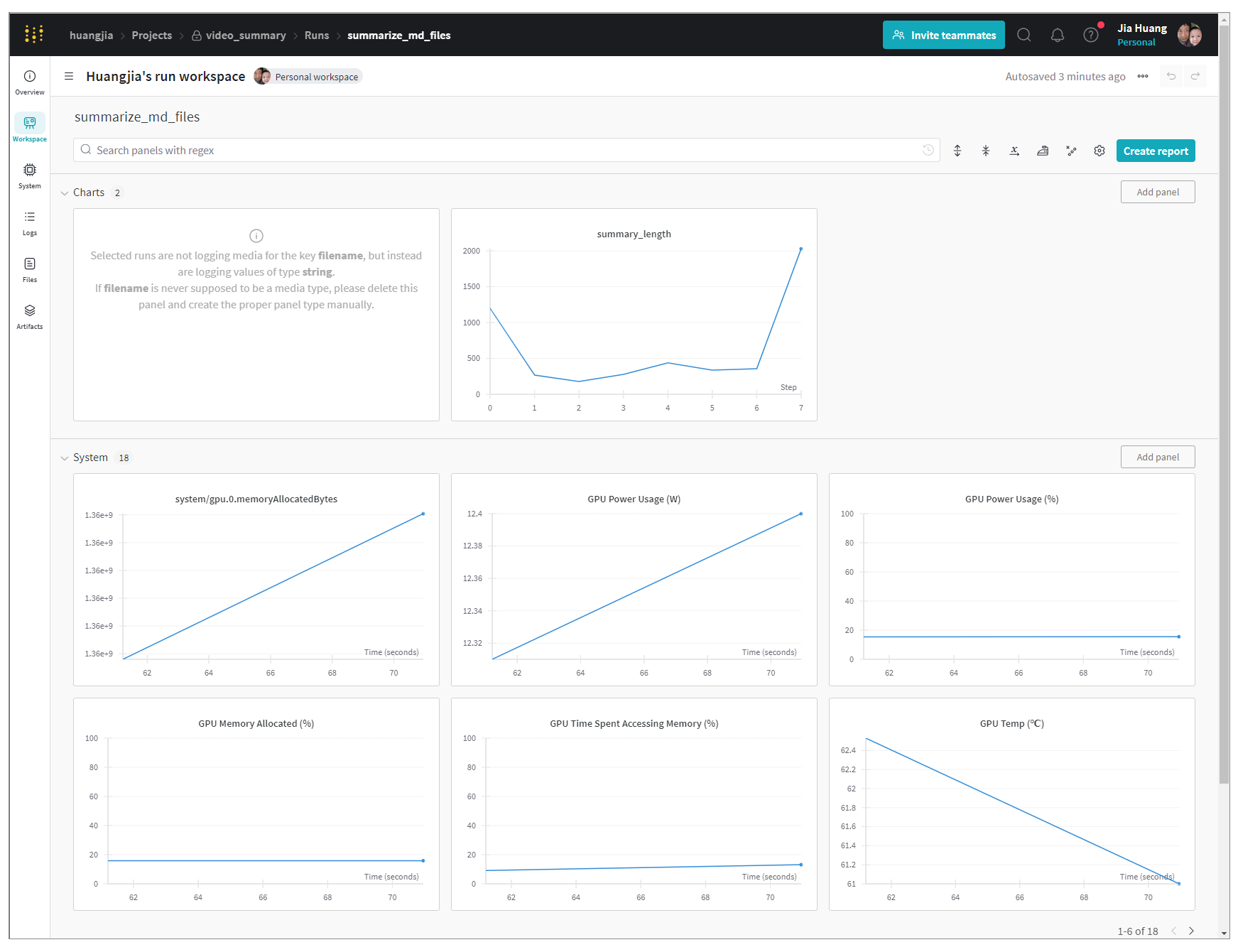 当然,更漂亮的是,在网页端,wandb满足了我们的核心需求:记录这些文件的summary的长度。同时还有其他一些信息,包括我跑代码时候GPU的使用情况。