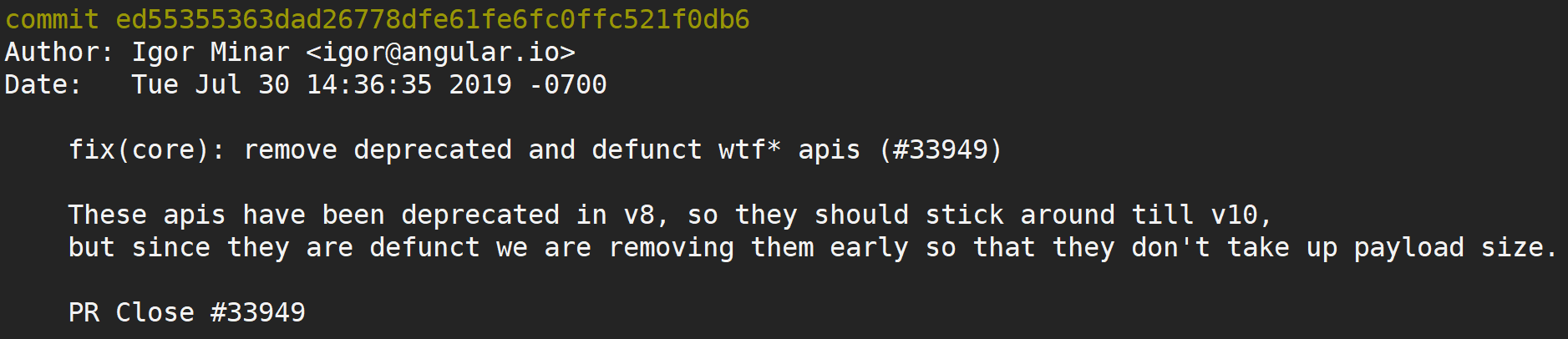 为了方便你理解 Angular 规范,我们直接看一个遵循 Angular 规范的 commit 历史记录,见下图: