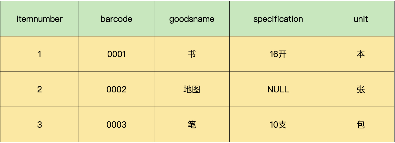 在刚刚的设计中,我们也完成了把属性都转换成了表的字段,比如把商品属性(包括条码、名称、规格、单位、价格)转换成了商品信息表中的字段:
