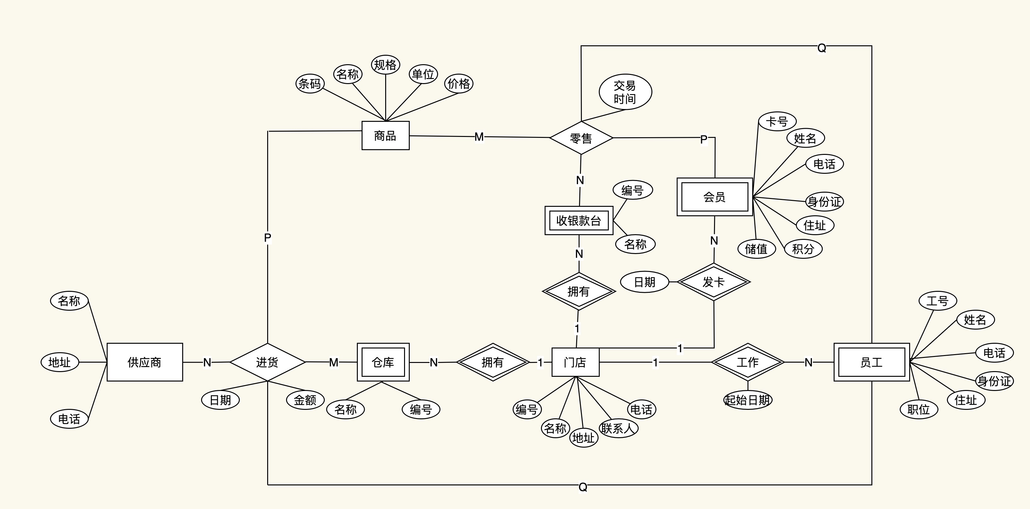 经过分析,我们发现,在超市的业务流程中,零售业务包括普通零售和会员零售两种模式。普通零售包含的实体,包括门店、商品和收银款台;会员零售包含的实体,包括门店、商品、会员和收银款台。