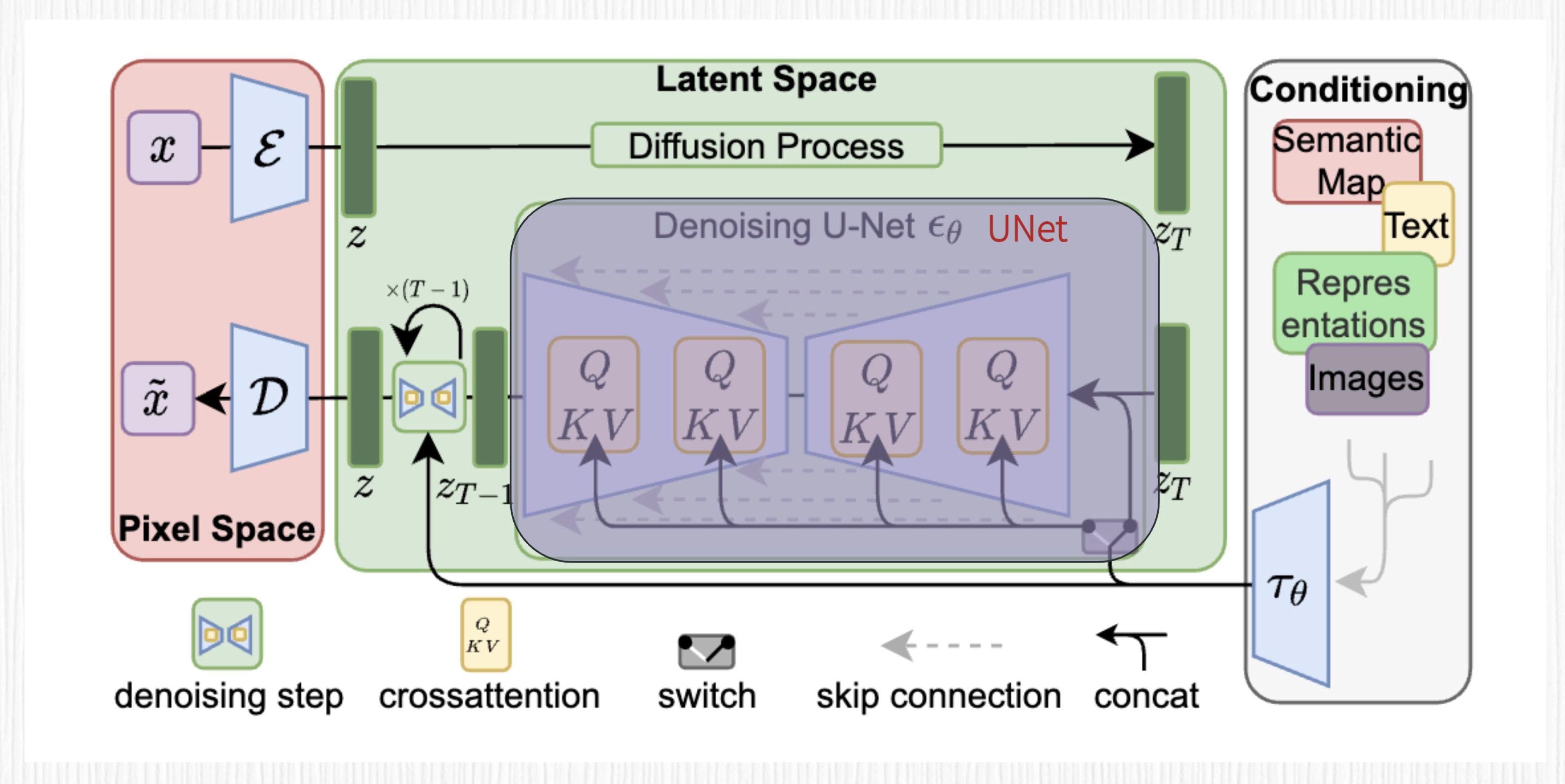 我们不妨再翻出Stable Diffusion的算法框架图回忆一下。图中最左侧粉色区域便是VAE模块,最右侧的条件控制模块便可以是CLIP(也可以是其他控制条件),而中间UNet部分展示的QKV模块,便是prompt通过交叉注意力机制引导图像生成。到此为止,是不是一切都串联起来了?