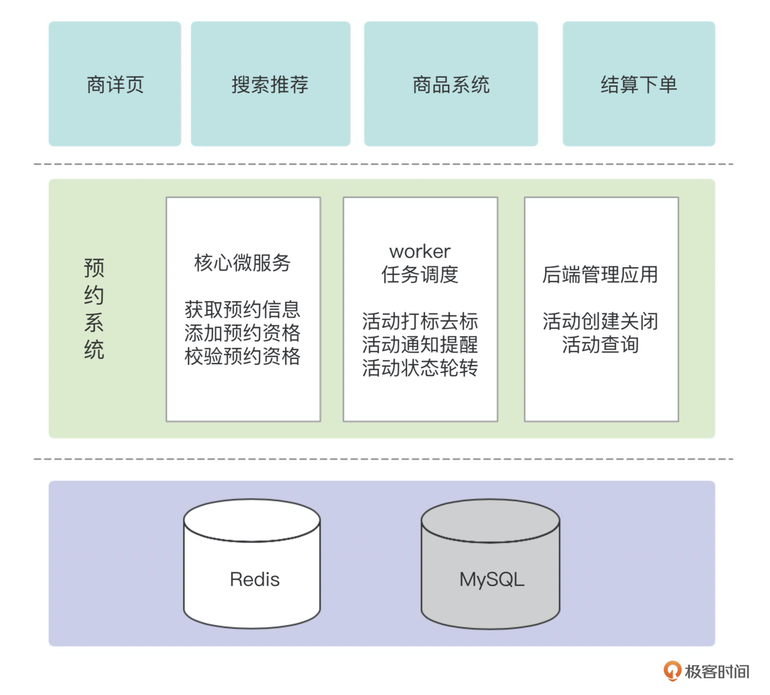 预约管理后台和预约worker的功能比较简单,这里就不展开介绍了。我们重点看下预约核心微服务系统的设计,包括接口、数据库和缓存。
