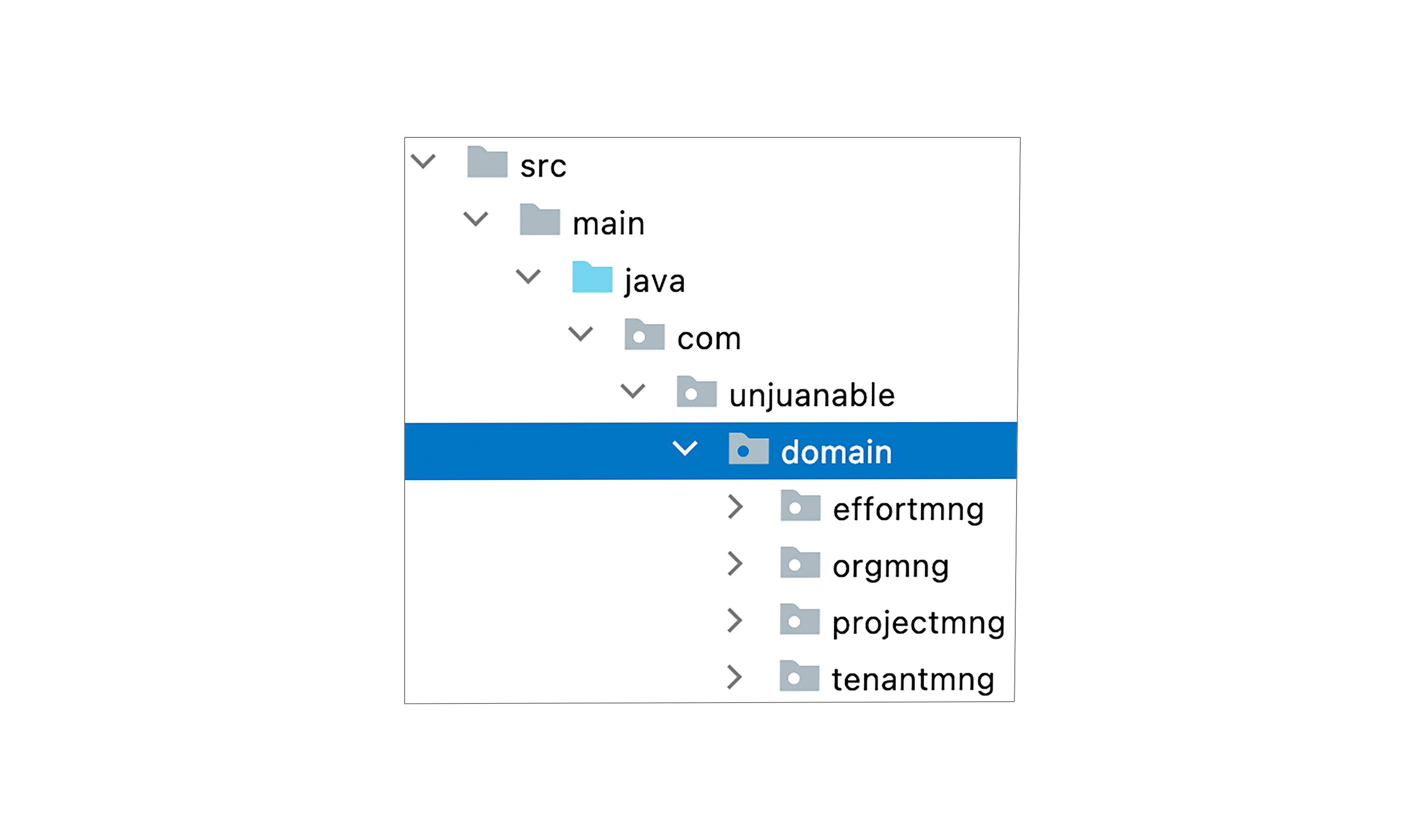 图中的Unjuanable 是项目的根,这是咱们自造的单词,就是“不要卷了”(un-juan-able)的意思,这是开个玩笑。而Effortmng、orgmng、projectmng 和tenantmng就是领域模型中的四个模块,命名还是依据之前建立的词汇表。