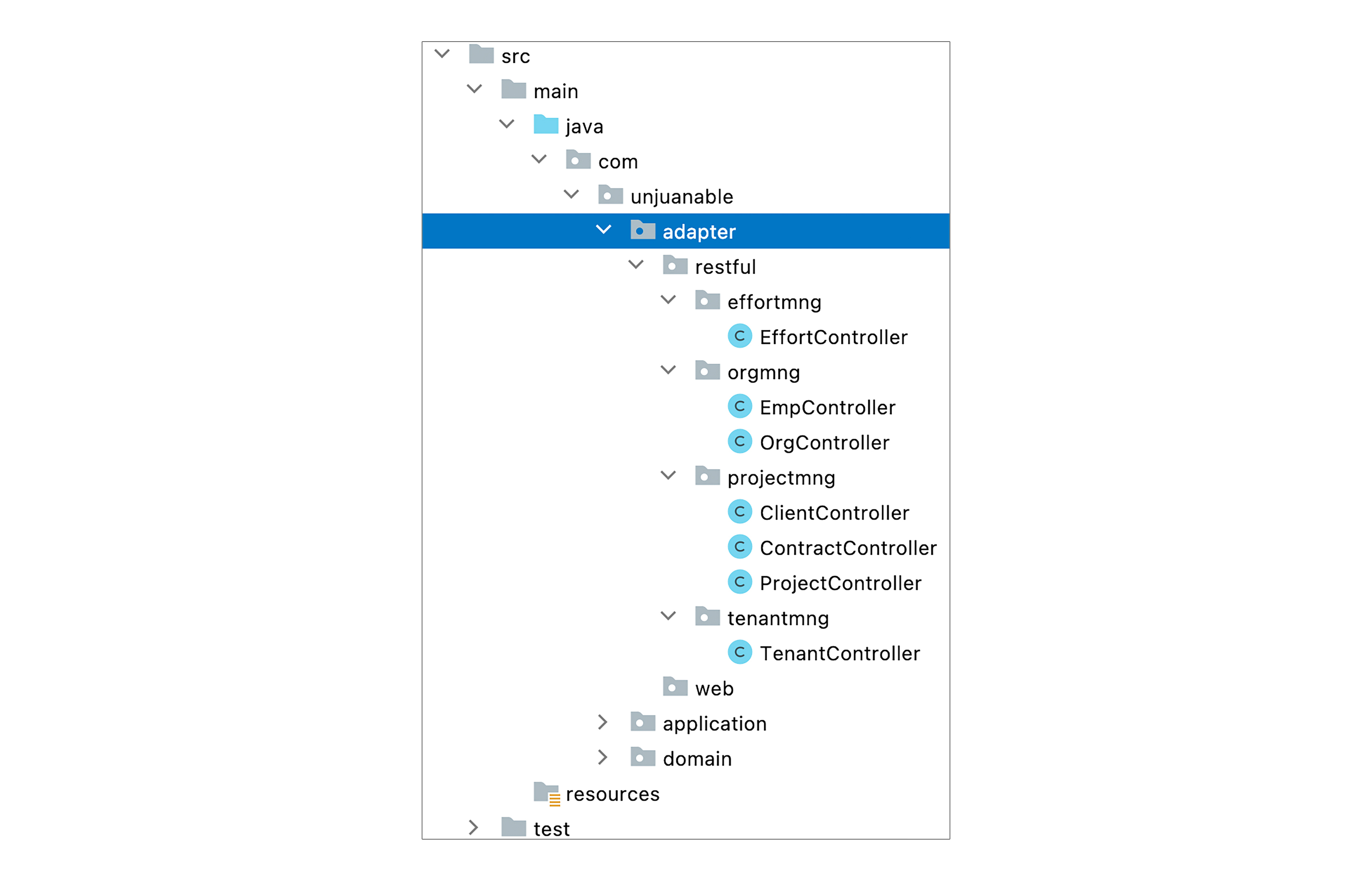 如果我们的系统要处理多种输入输出技术,那么适配器层可以按照具体技术来分包。比如在上面的代码例子里, Restful包里是Resful Api,web包里面是传统的JSP页面。这些包里的适配器,在多数情况下,就是我们熟悉的Controller。不过,我们并不打算在这个项目里真的使用JSP,这里的web只是为了举例。