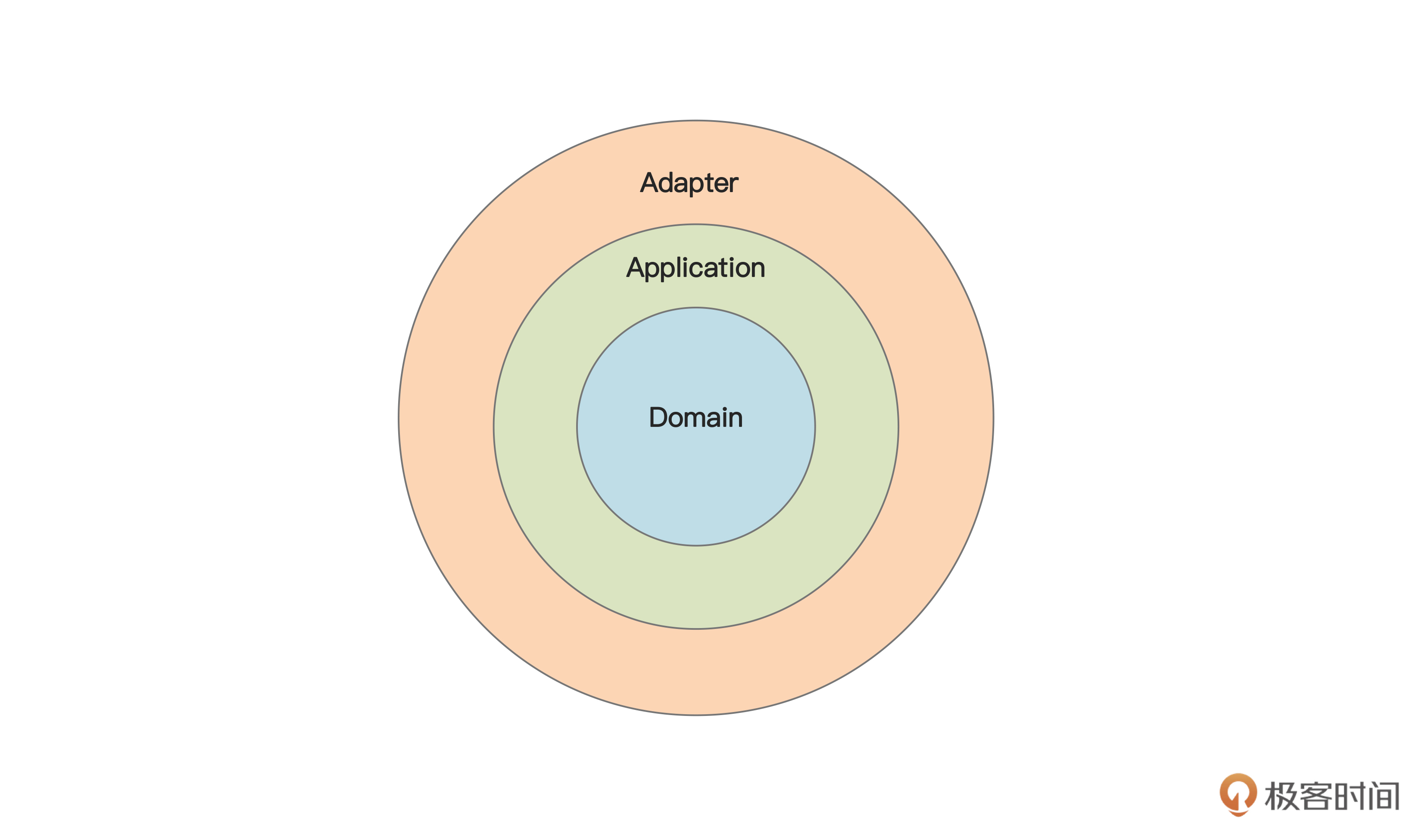 那么,领域层封装的逻辑通常是细粒度的,并不适合直接作为API暴露给外部。另外,还有一些不属于领域层的横切关注点,比如像事务控制,应该单独处理。所以,我们往往要在领域层外面再加一层,DDD和六边形架构都将这一层称为Application,也就是应用层。如下图所示: