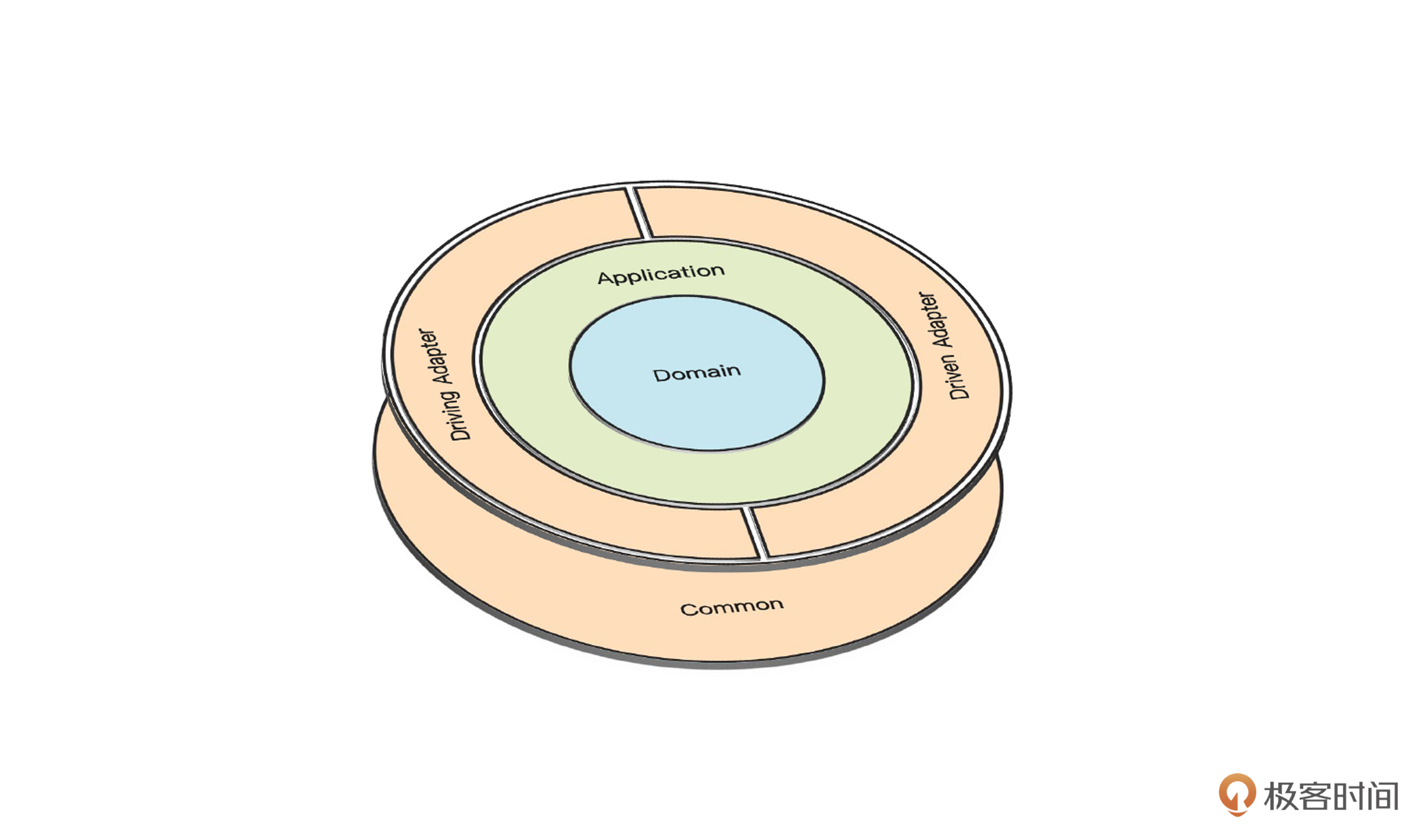 你看,我们前面讲过的领域层、应用层和适配器层处于同一个平面,而公共支撑部分在另一个平面,对上面的平面进行支撑。这一层倒是没有什么统一的名字,不过业界很多人喜欢把它叫做 common。下面就是增加了common层的代码结构: