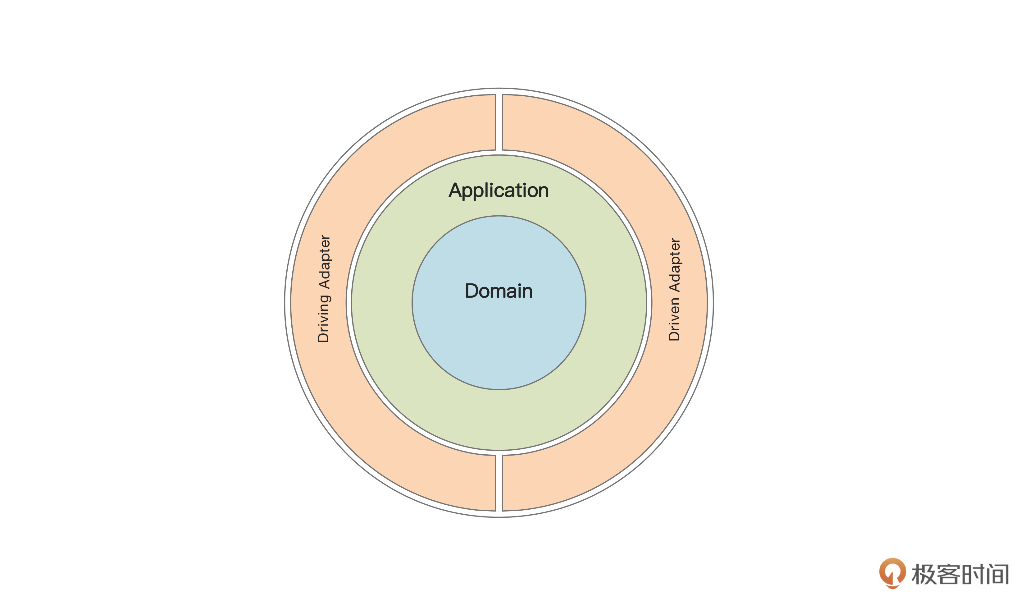 被动适配器,用来访问外部资源。被动适配器和主动适配器都属于适配器层,区别在于调用的方向不同。适配器层与具体输入输出和资源访问技术有关,而应用层和领域层与具体技术无关。这样我们就分离了技术和业务的关注点。
