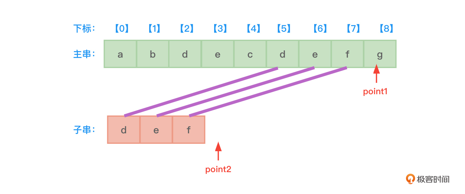 - 开始时,先设置两根指针point1和point2,分别指向主串和子串的开始地址,也就是下标0的位置。
