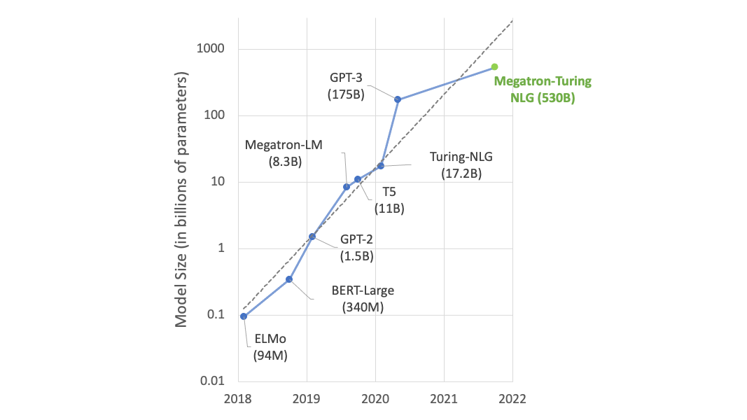 后面这张图就是个典型例子,我们可以看到,语言模型的参数数量以每年10倍的速度增长。