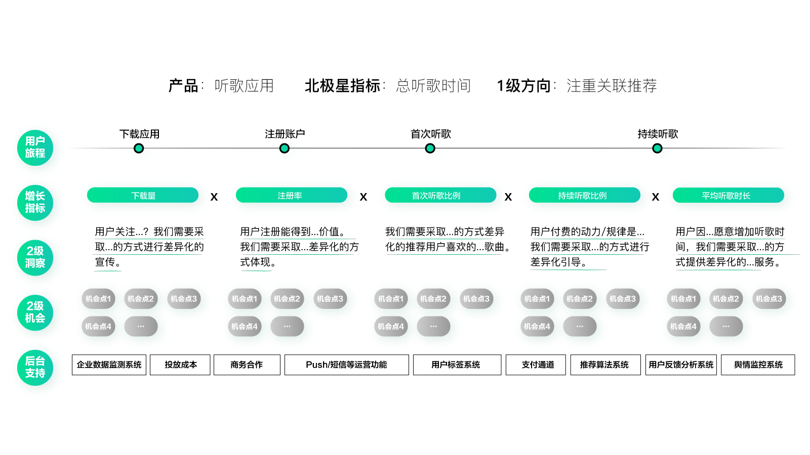 假设有一个听歌应用,当前阶段的北极星指标是“总听歌时间”,一级方向是:“注重关联推荐”。