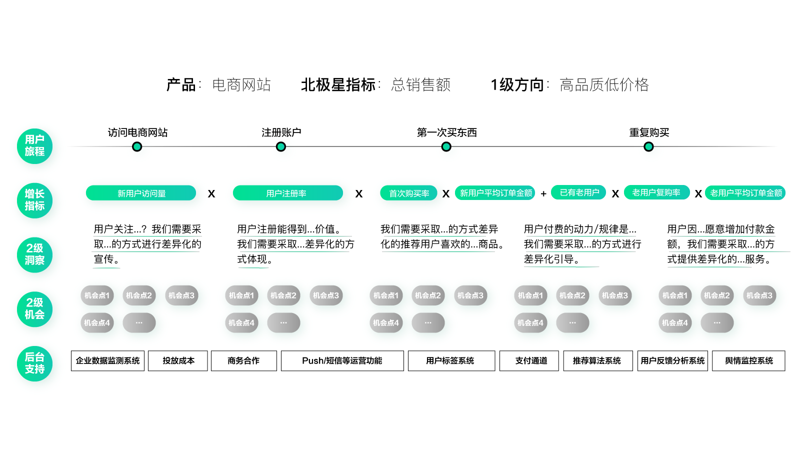 这款产品的用户旅程及对应的增长指标可以是:访问电商网站(新用户访问量)→注册账户(注册率)→第一次买东西(首次购买率、新用户平均订单金额)→重复购买(已有老用户数、老用户复购率、老用户平均订单金额)。