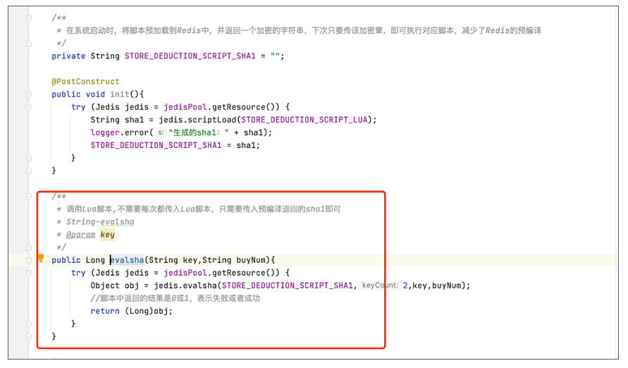 以上是将Lua脚本转成字符串形式,并通过@PostConstruct完成脚本的预加载。然后新增EVALSHA方法,如下图所示: