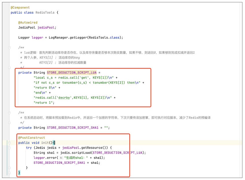 这样的话,我们通过预加载命令,将Lua脚本先存储在Redis中,并返回一个sha1,下次要执行对应脚本时,只需要传入sha1即可执行对应的脚本。这完美地解决了EVAL命令存在的弊端,所以我们这里也是基于EVALSHA方式来实现的。