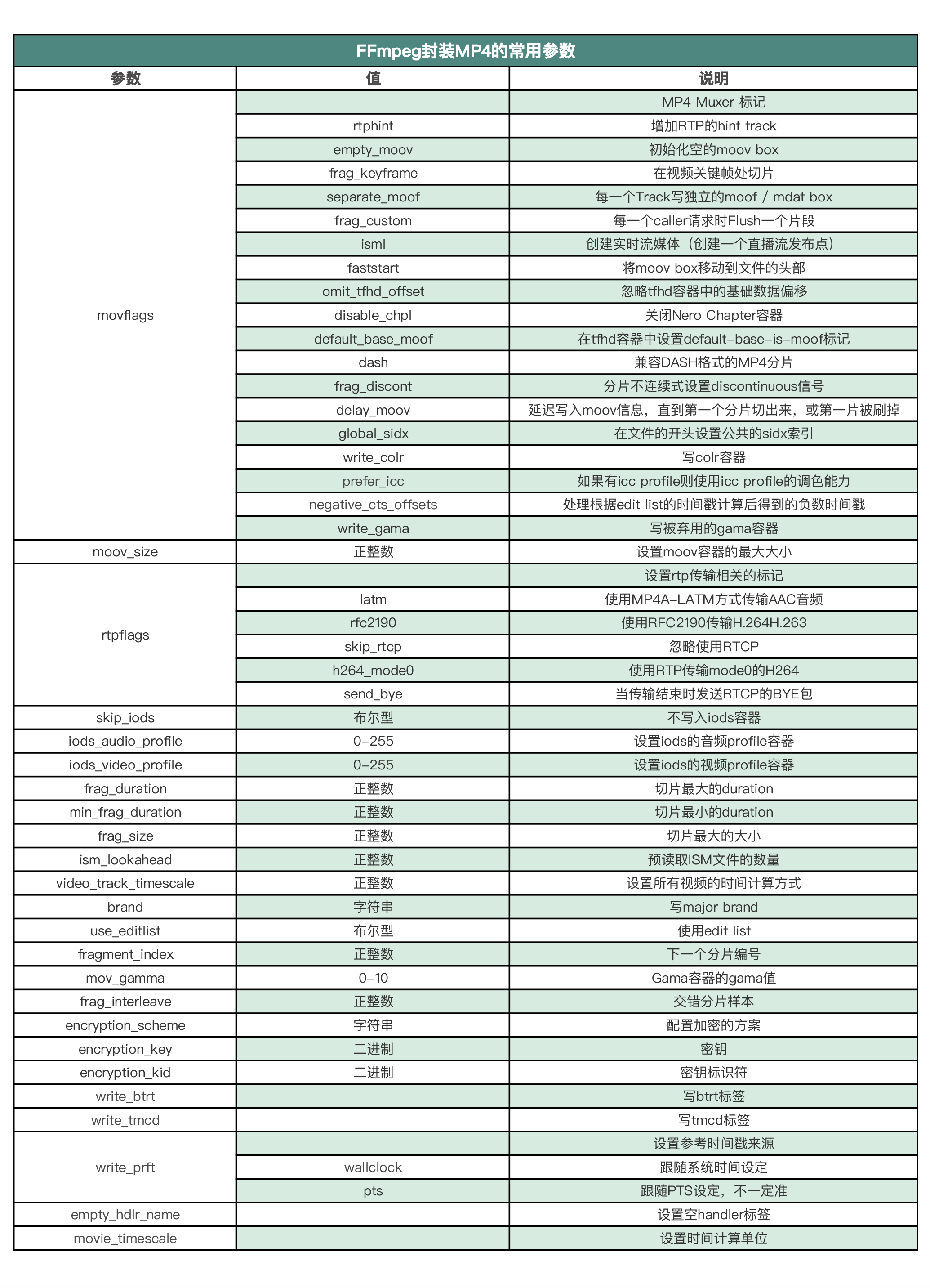 Muxer mp4 [MP4 (MPEG-4 Part 14)]: Common extensions: mp4. Mime type: video/mp4. Default video codec: h264. Default audio codec: aac. mov/mp4/tgp/psp/tg2/ipod/ismv/f4v muxer AVOptions: -movflags <flags> E.......... MOV muxer flags (default 0) rtphint E.......... Add RTP hint tracks empty_moov E.......... Make the initial moov atom empty frag_keyframe E.......... Fragment at video keyframes frag_every_frame E.......... Fragment at every frame separate_moof E.......... Write separate moof/mdat atoms for each track frag_custom E.......... Flush fragments on caller requests isml E.......... Create a live smooth streaming feed (for pushing to a publishing point) faststart E.......... Run a second pass to put the index (moov atom) at the beginning of the file omit_tfhd_offset E.......... Omit the base data offset in tfhd atoms disable_chpl E.......... Disable Nero chapter atom default_base_moof E.......... Set the default-base-is-moof flag in tfhd atoms dash E.......... Write DASH compatible fragmented MP4 cmaf E.......... Write CMAF compatible fragmented MP4 frag_discont E.......... Signal that the next fragment is discontinuous from earlier ones delay_moov E.......... Delay writing the initial moov until the first fragment is cut, or until the first fragment flush global_sidx E.......... Write a global sidx index at the start of the file skip_sidx E.......... Skip writing of sidx atom write_colr E.......... Write colr atom even if the color info is unspecified (Experimental, may be renamed or changed, do not use from scripts) prefer_icc E.......... If writing colr atom prioritise usage of ICC profile if it exists in stream packet side data write_gama E.......... Write deprecated gama atom use_metadata_tags E.......... Use mdta atom for metadata. skip_trailer E.......... Skip writing the mfra/tfra/mfro trailer for fragmented files negative_cts_offsets E.......... Use negative CTS offsets (reducing the need for edit lists) -moov_size <int> E.......... maximum moov size so it can be placed at the begin (from 0 to INT_MAX) (default 0) -rtpflags <flags> E.......... RTP muxer flags (default 0) latm E.......... Use MP4A-LATM packetization instead of MPEG4-GENERIC for AAC rfc2190 E.......... Use RFC 2190 packetization instead of RFC 4629 for H.263 skip_rtcp E.......... Don't send RTCP sender reports h264_mode0 E.......... Use mode 0 for H.264 in RTP send_bye E.......... Send RTCP BYE packets when finishing -skip_iods <boolean> E.......... Skip writing iods atom. (default true) -iods_audio_profile <int> E.......... iods audio profile atom. (from -1 to 255) (default -1) -iods_video_profile <int> E.......... iods video profile atom. (from -1 to 255) (default -1) -frag_duration <int> E.......... Maximum fragment duration (from 0 to INT_MAX) (default 0) -min_frag_duration <int> E.......... Minimum fragment duration (from 0 to INT_MAX) (default 0) -frag_size <int> E.......... Maximum fragment size (from 0 to INT_MAX) (default 0) -ism_lookahead <int> E.......... Number of lookahead entries for ISM files (from 0 to 255) (default 0) -video_track_timescale <int> E.......... set timescale of all video tracks (from 0 to INT_MAX) (default 0) -brand <string> E.......... Override major brand -use_editlist <boolean> E.......... use edit list (default auto) -fragment_index <int> E.......... Fragment number of the next fragment (from 1 to INT_MAX) (default 1) -mov_gamma <float> E.......... gamma value for gama atom (from 0 to 10) (default 0) -frag_interleave <int> E.......... Interleave samples within fragments (max number of consecutive samples, lower is tighter interleaving, but with more overhead) (from 0 to INT_MAX) (default 0) -encryption_scheme <string> E.......... Configures the encryption scheme, allowed values are none, cenc-aes-ctr -encryption_key <binary> E.......... The media encryption key (hex) -encryption_kid <binary> E.......... The media encryption key identifier (hex) -use_stream_ids_as_track_ids <boolean> E.......... use stream ids as track ids (default false) -write_btrt <boolean> E.......... force or disable writing btrt (default auto) -write_tmcd <boolean> E.......... force or disable writing tmcd (default auto) -write_prft <int> E.......... Write producer reference time box with specified time source (from 0 to 2) (default 0) wallclock 1 E.......... pts 2 E.......... -empty_hdlr_name <boolean> E.......... write zero-length name string in hdlr atoms within mdia and minf atoms (default false) -movie_timescale <int> E.......... set movie timescale (from 1 to INT_MAX) (default 1000)