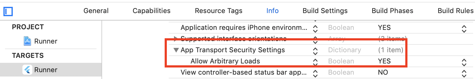然后,我们需要切换到Application Target的Info面板,手动配置NSAppTransportSecurity键值对,以支持极光SDK非https域名服务: