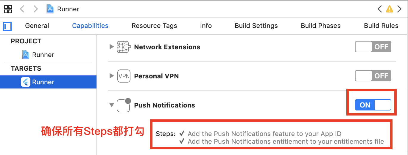 首先,我们需要为example工程开启Application Target的Capabilities->Push Notifications选项,启动应用的推送能力支持,如下图所示: