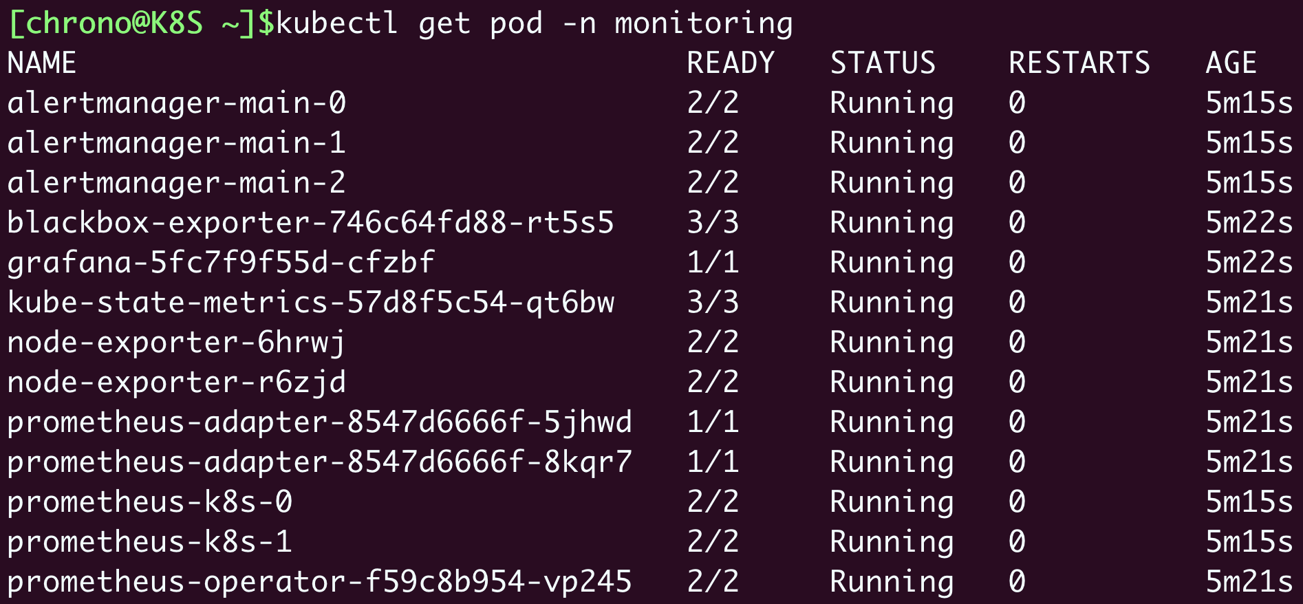 Prometheus的对象都在名字空间“monitoring”里,创建之后可以用 kubectl get 来查看状态: