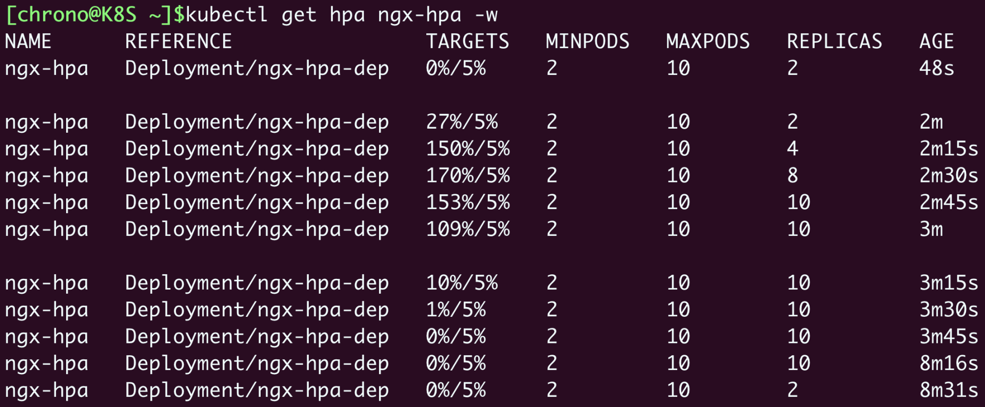 1 | ab -c 10 -t 60 -n 1000000 'http://ngx-hpa-svc/' |