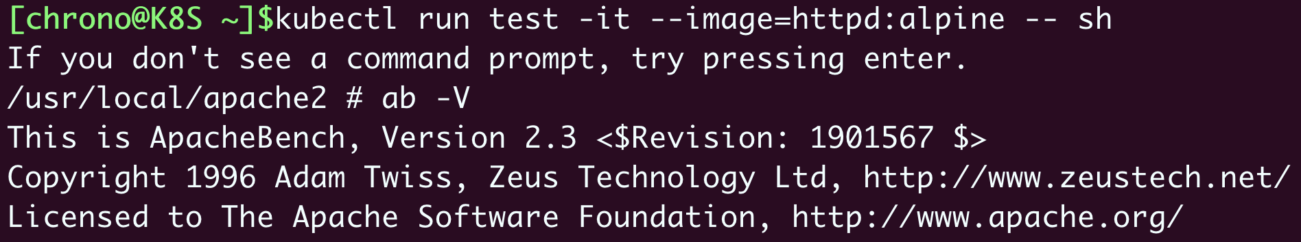 1 | kubectl run test -it --image=httpd:alpine -- sh |