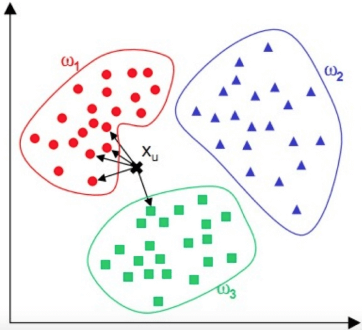 图中,红蓝绿三种颜色的点为样本数据,分属三种类别$w_{1}$、$w_{2}$、 $w_{3}$ 。对于待分类点$X_{u}$ ,计算和它距离最近的5个点(即K为5),这5个点最多归属的类别为$w_{1}$(4个点归属$w_{1}$,1个点归属$w_{3}$),那么$X_{u}$的类别被分类为$w_{1}$。