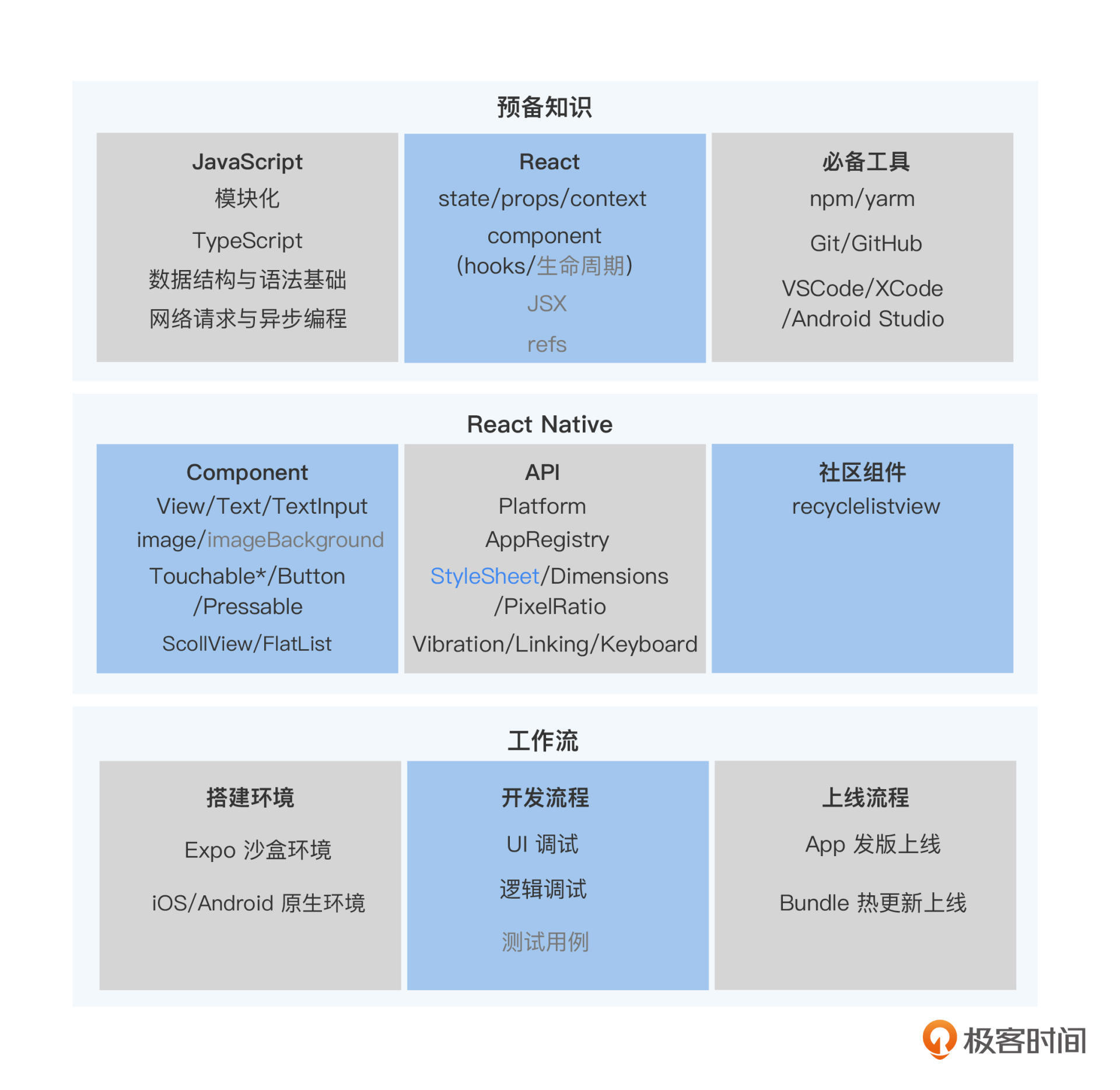 那所谓的基础知识是什么呢?**我认为能够满足开发业务的最小知识集合都是基础。**比如,语言、框架和一些编程的必备工具,还有 React Native 框架和社区提供的核心组件、核心 API,再有就是熟悉工作流包括搭建环境、开发流程、上线流程,这些都是 React Native 的基础知识。