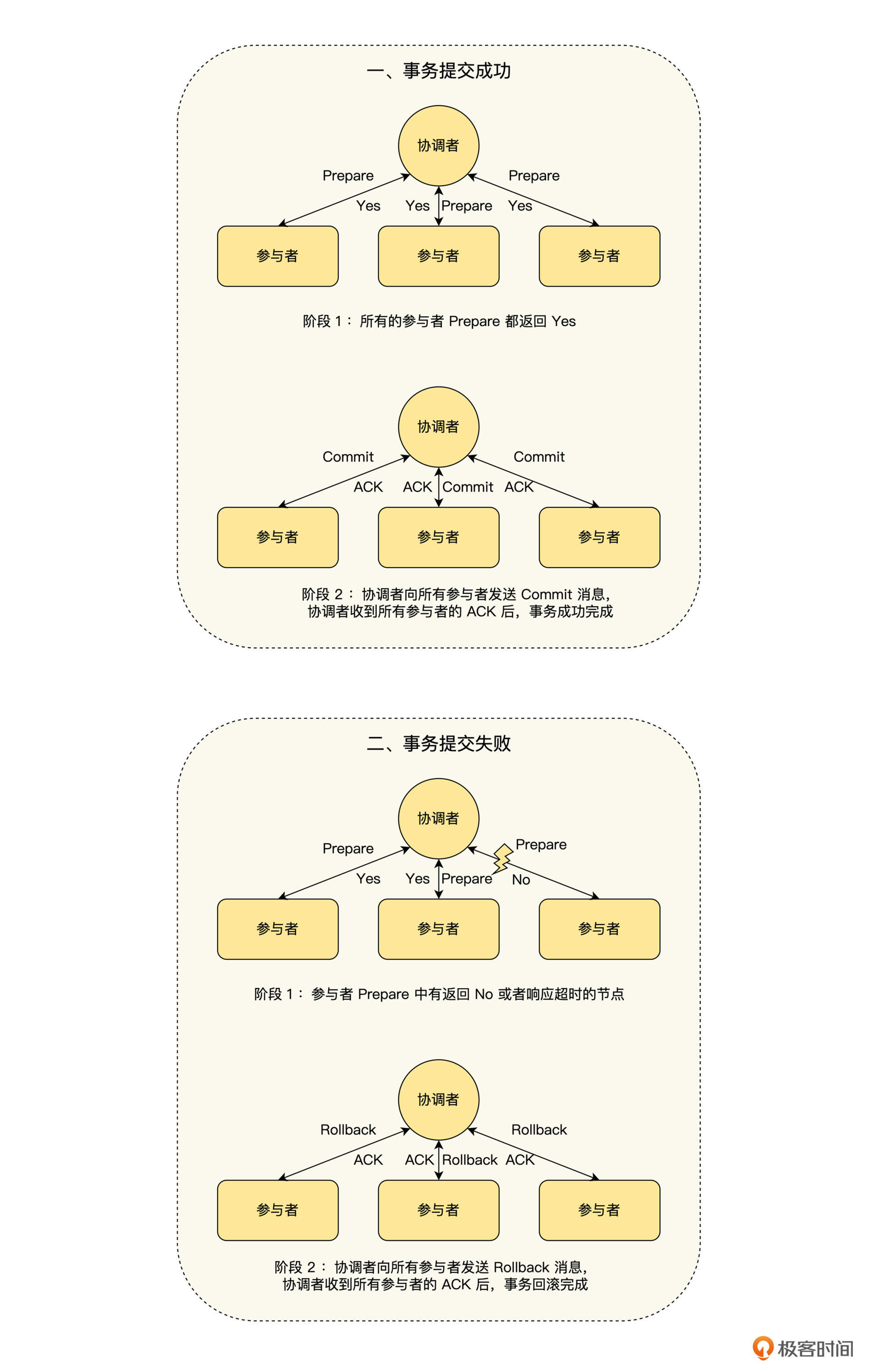 - 如果任何的参与节点都回复“否”,那么接下来协调者在阶段 2 发出放弃(Rollback)请求。