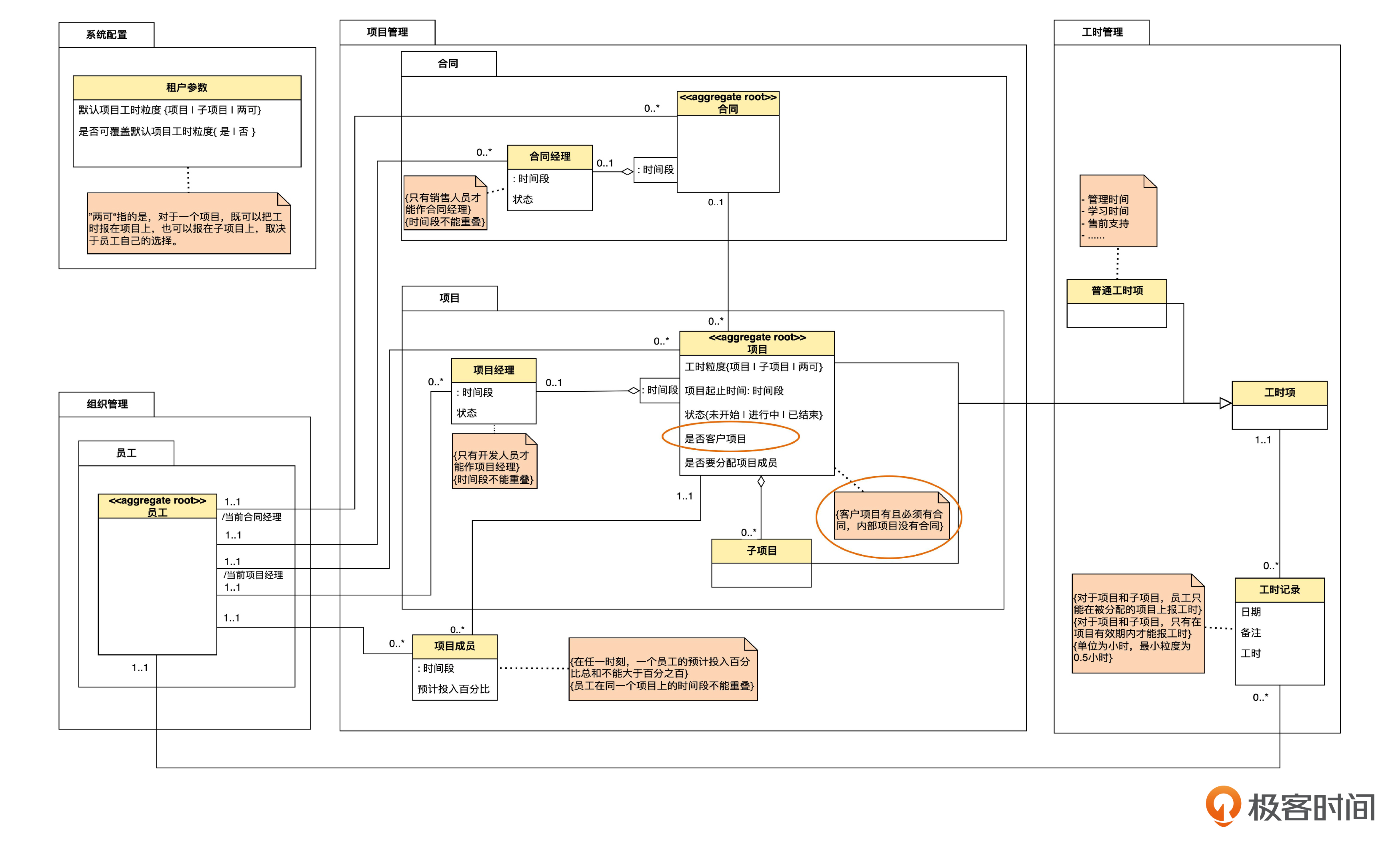 另一种是先识别出父类,然后发现这个类中的不同对象有一些显著的差异,需要再分成两个子类。例如第23课,我们先识别出项目,然后发现“客户项目有合同,内部项目没有合同”这一差异,于是可以识别出客户项目和内部项目两个子类。