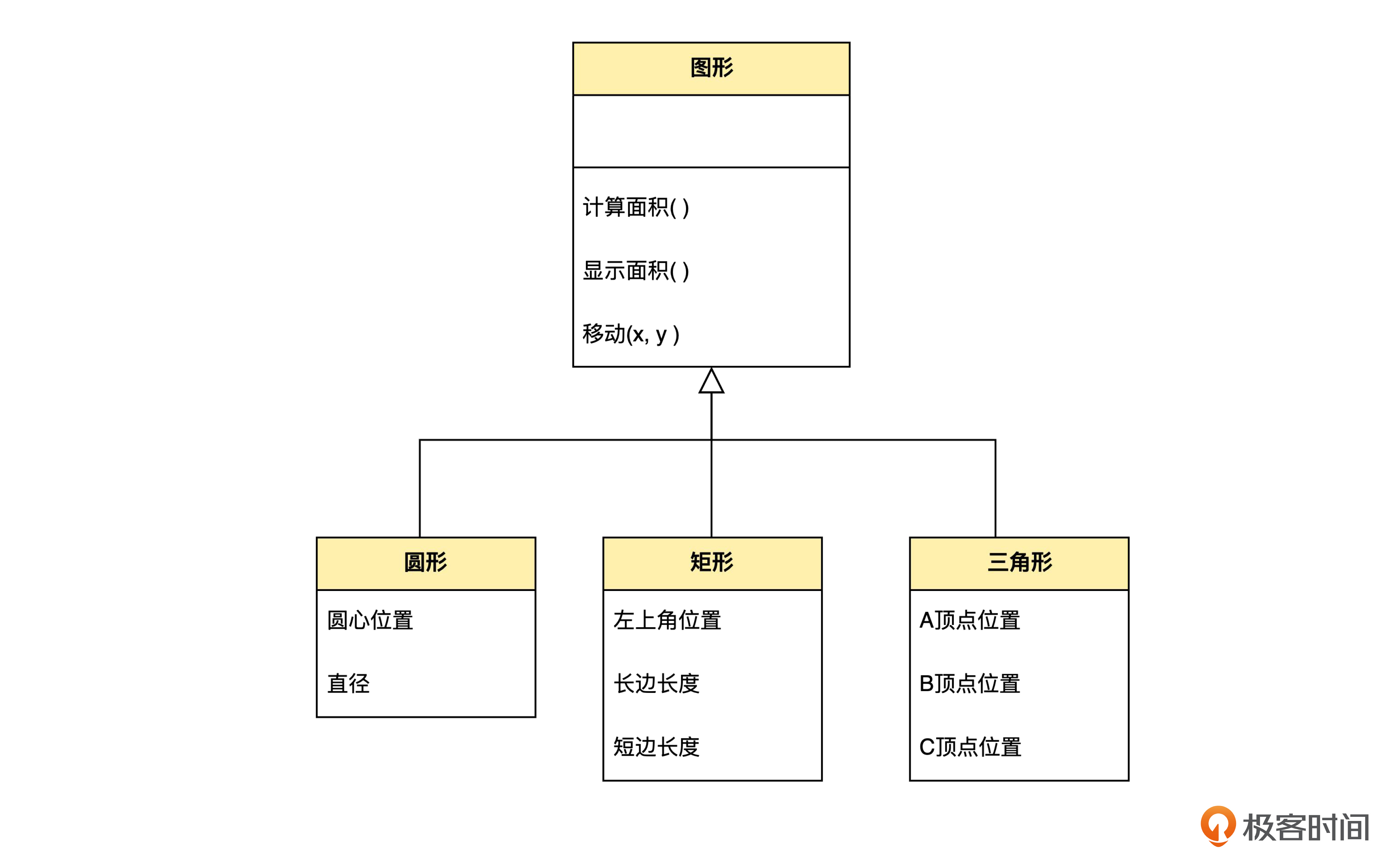 圆形、矩形和三角形都是图形。它们有共同的操作接口,例如“计算面积()”“移动()”等。不过,具体的逻辑是在子类里多态地实现的。