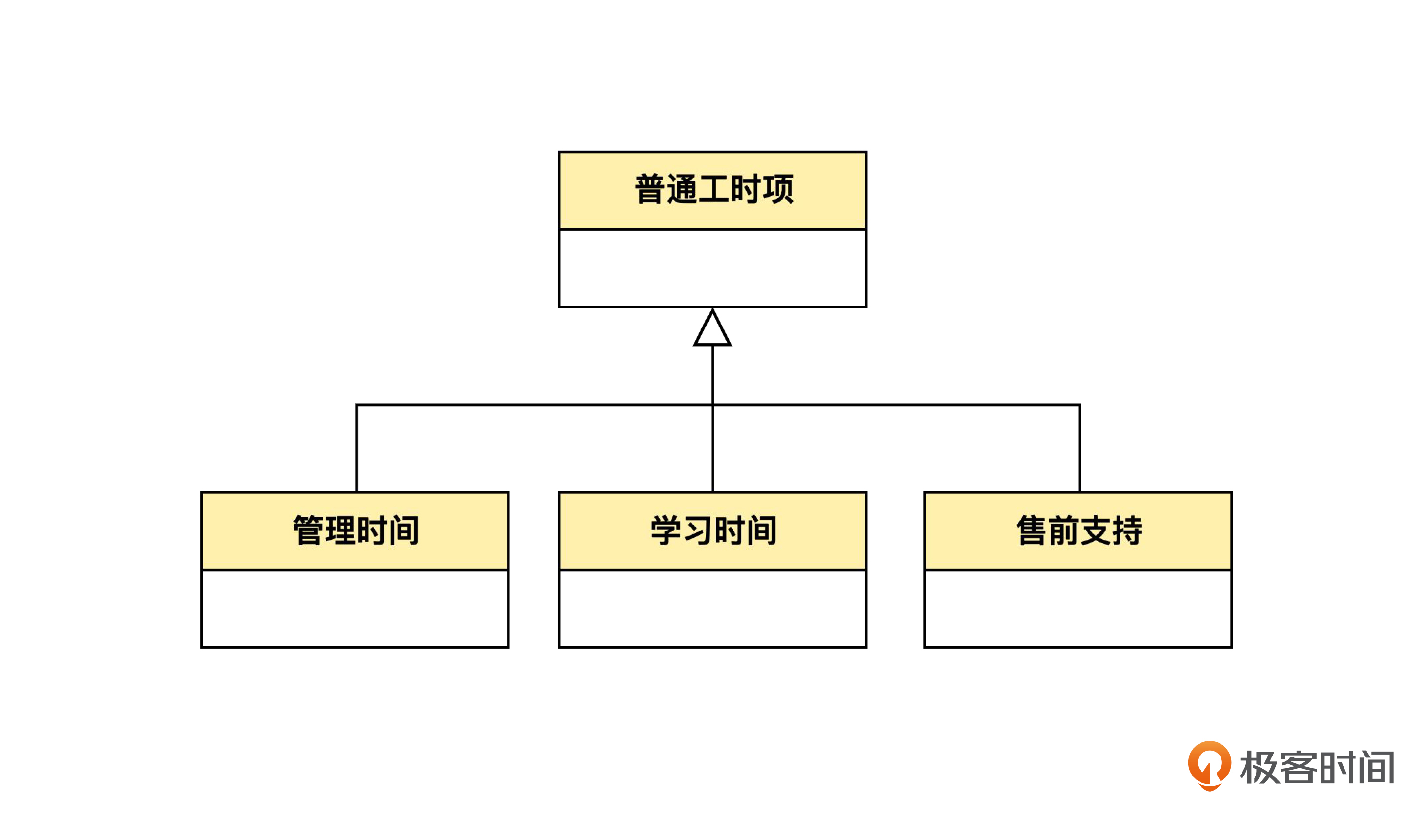 但是我们现在没有这个需求,学习时间和管理时间都是不需要再细分的。这时候,普通工时项就是一个类,而学习时间和管理时间只是这个类的实例,所以就无所谓泛化了。