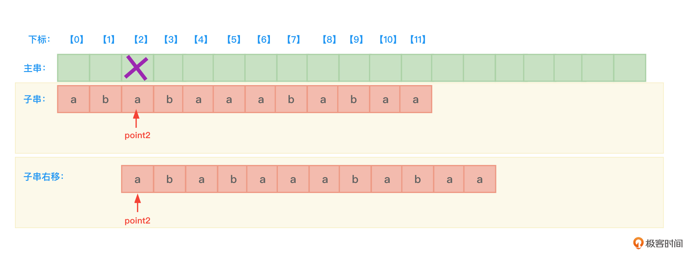如果下标2位置与主串不匹配,则找下标2位置左侧的公共前后缀,但左侧内容是“ab”,所以不存在公共前后缀。所以子串的第1个字符直接与主串当前位置的字符做比较,相当于子串右移。如图12所示: