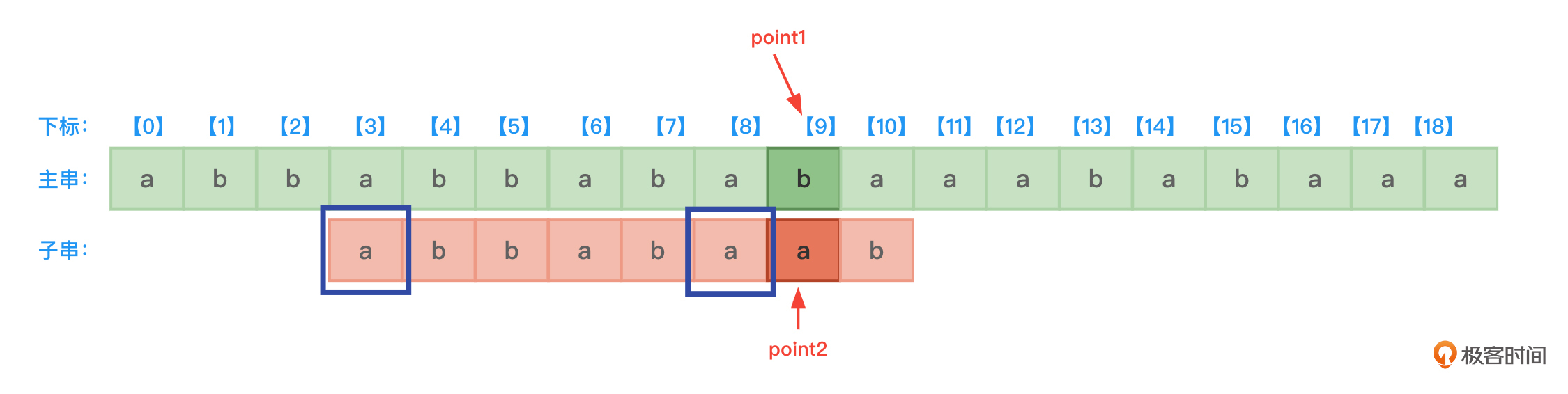 - 下标9号位置子串的字符如果与主串字符不匹配则后续就要用子串的第4个字符(字符b)与主串当前位(9号下标位)字符做比较。