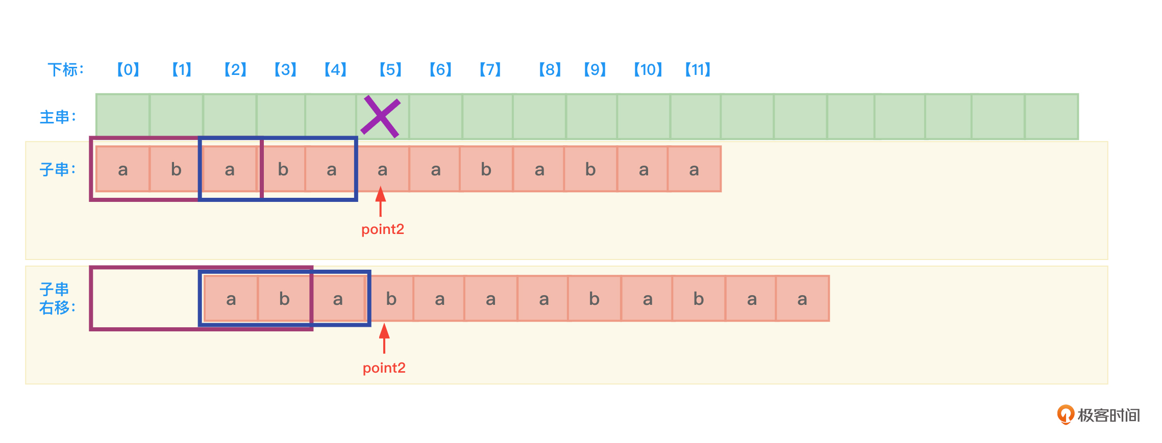 此时,把公共前缀移动到公共后缀的位置。注意看,子串依次向后移动了多个位置,效率肯定更高。那在写程序的时候怎么体现子串向后移动了多个位置呢?其实只是设置一下point2指针的位置不再从字串的0下标开始而是从子串的2下标开始。