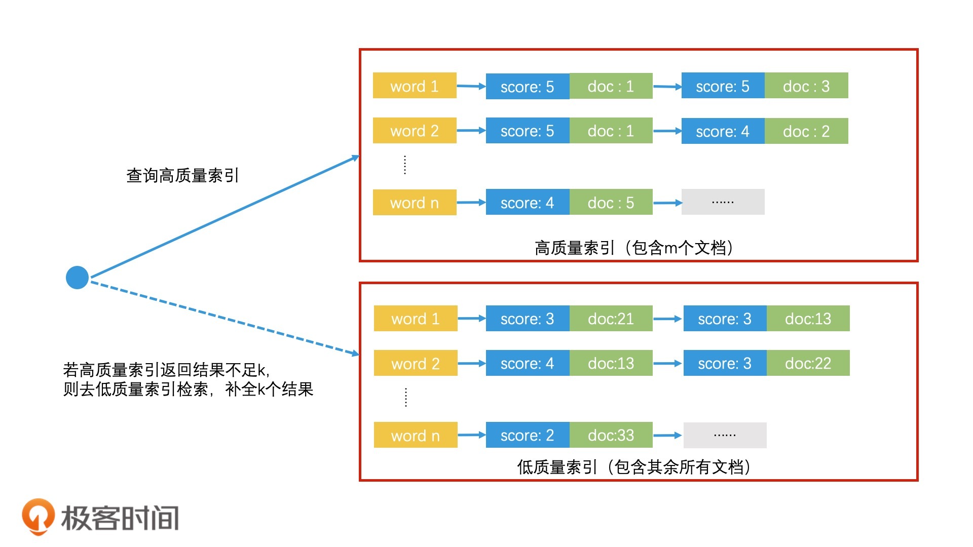 在实际检索的时候,我们会先去高质量索引中查询,如果高质量索引中可以返回的结果大于k个,我们直接截取Top K个结果返回即可;如果高质量索引中的检索结果不足k个,那我们再去低质量索引中查询,补全到k个结果,然后终止查询。通过这样的分层索引,我们就能快速地完成Top K的检索了。