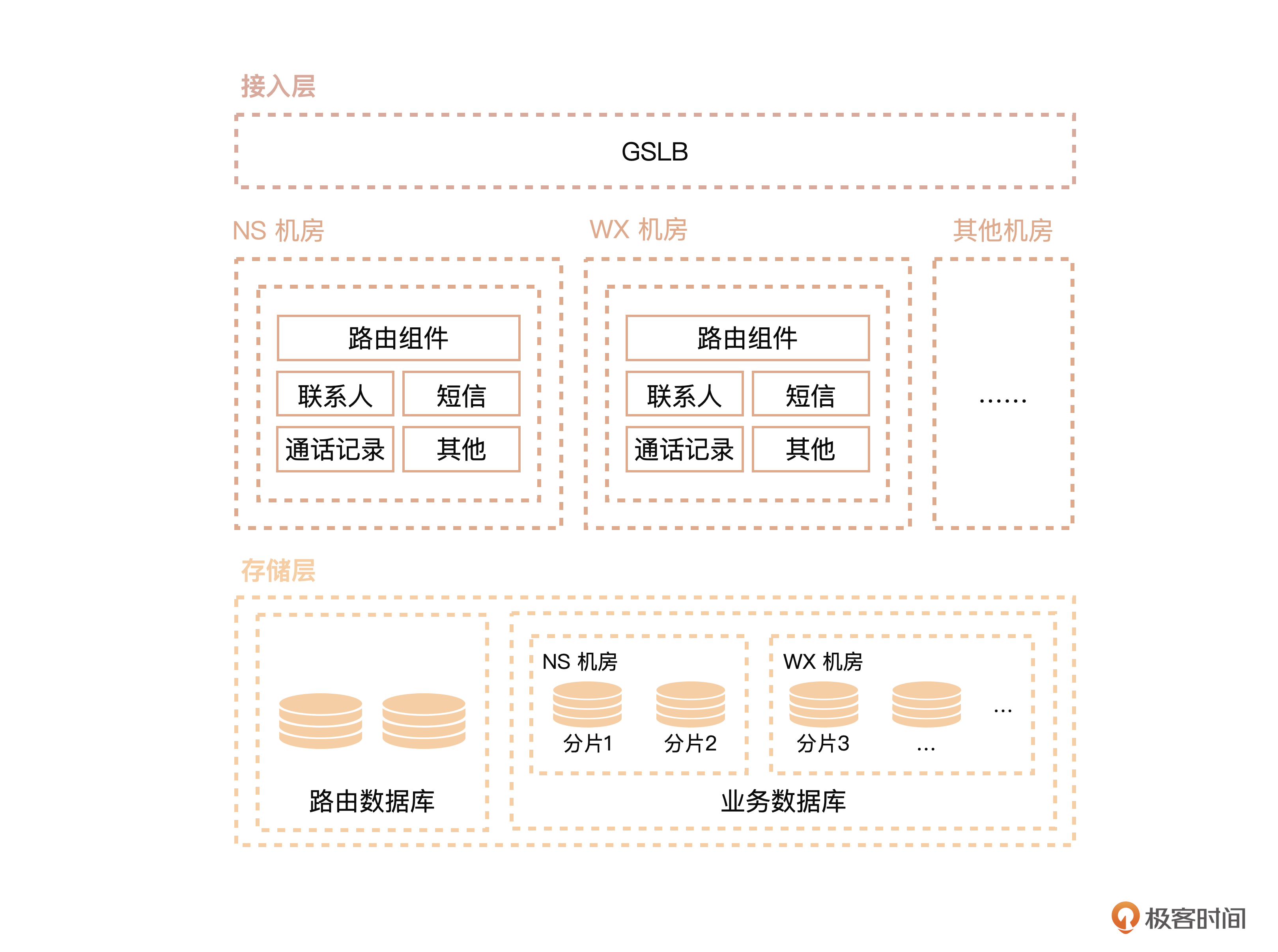 第3层是存储层。注意,这里有一个路由数据库,这个路由数据库搭配了路由组件,为用户找到数据所在的机房。每个机房存储了一部分用户的数据,所有机房的用户数据加起来才是一份完整的数据。这就相当于每个机房都只是一个横向的用户数据分片。当然,每个机房的数据库都做了主备容灾。
