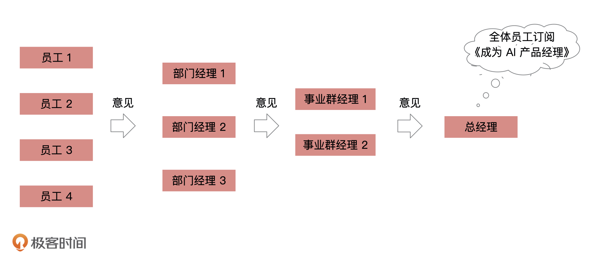 说到这,不知道你意识到一个问题没有,如果只是把“员工”意见反馈给“总经理”,那中间几层的“领导”就没有存在意义了,因为“员工”完全可以直接跳过所有“领导”把意见传递给最终的“总经理”。