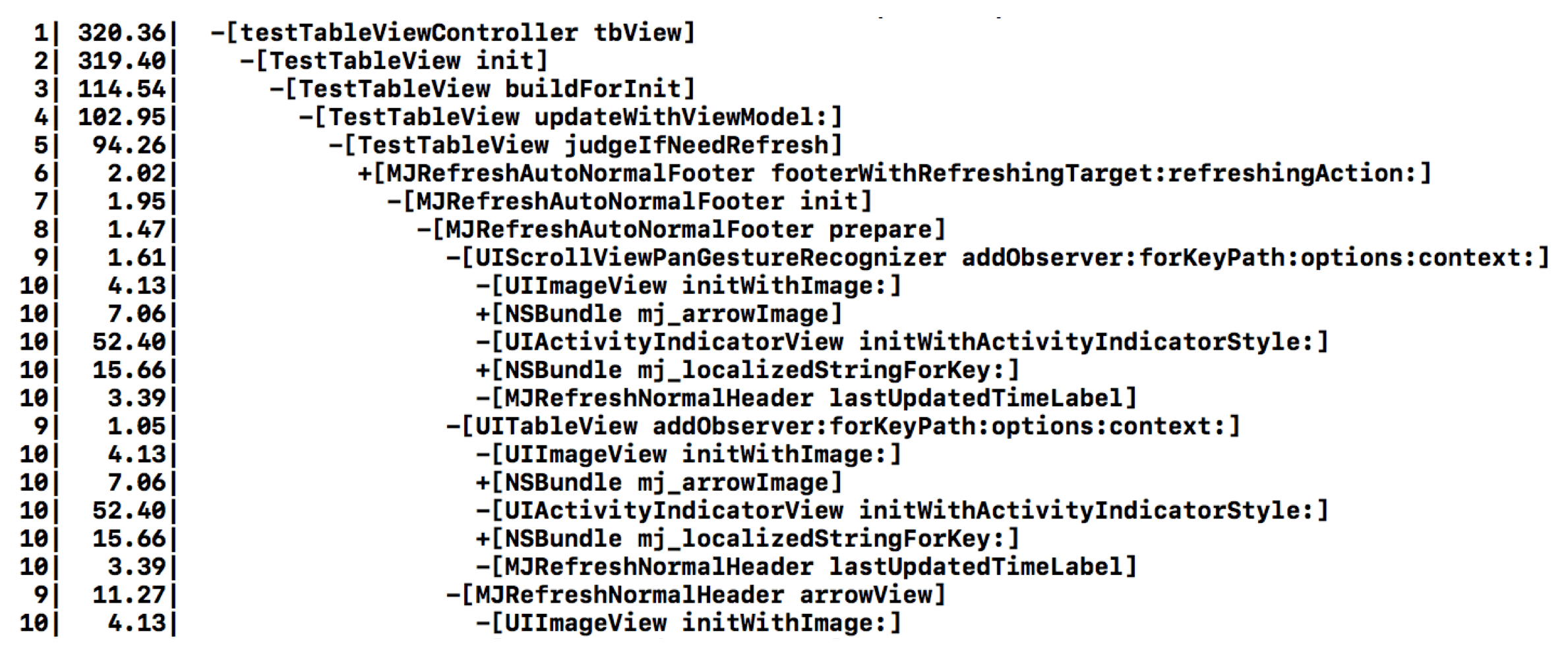 现在,你就可以得到每个 Objective-C 方法的耗时了。接下来,我们再看看怎样才能够做到像下图那样记录和展示方法调用的层级关系和顺序呢?
