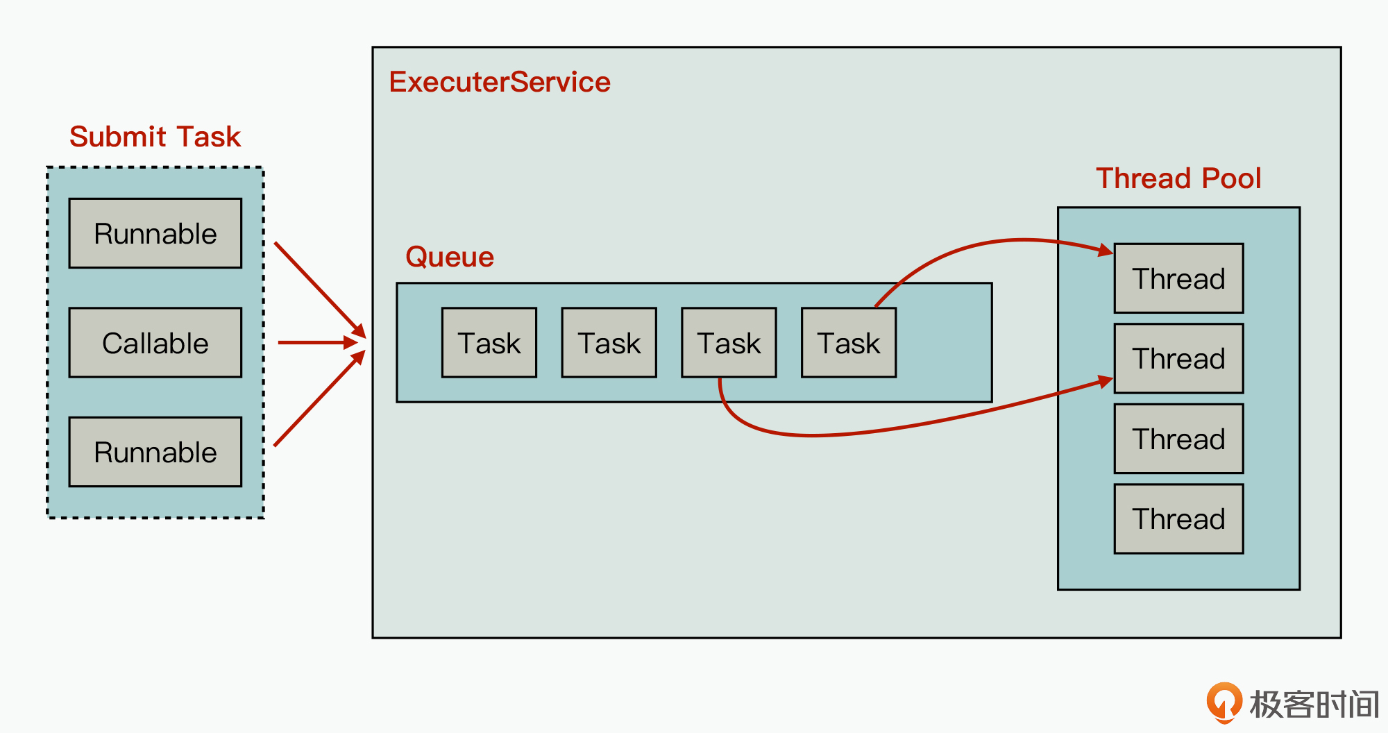 从图的左边开始看,继承接口Runnable、Callable的具体实现任务,在调用ExecutorService.submit接口时,会提交任务到ExecutorService内部的一个任务队列中。同时,在ExecutorService内部还存在一个预先申请的线程池(Thread Pool),线程池中的线程会从任务队列中领取一个任务来执行。