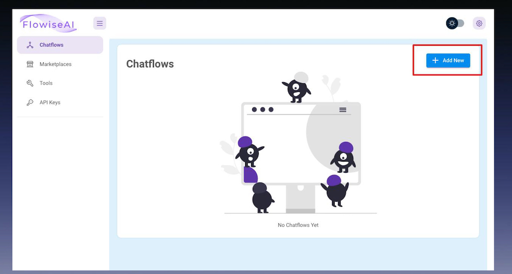 进入浏览器打开 http://localhost:3000,输入用户名和密码。如果能看到下图中的Flowise界面,恭喜你已经搭建成功了。现在,我们开始搭建ChatGPT的例子。